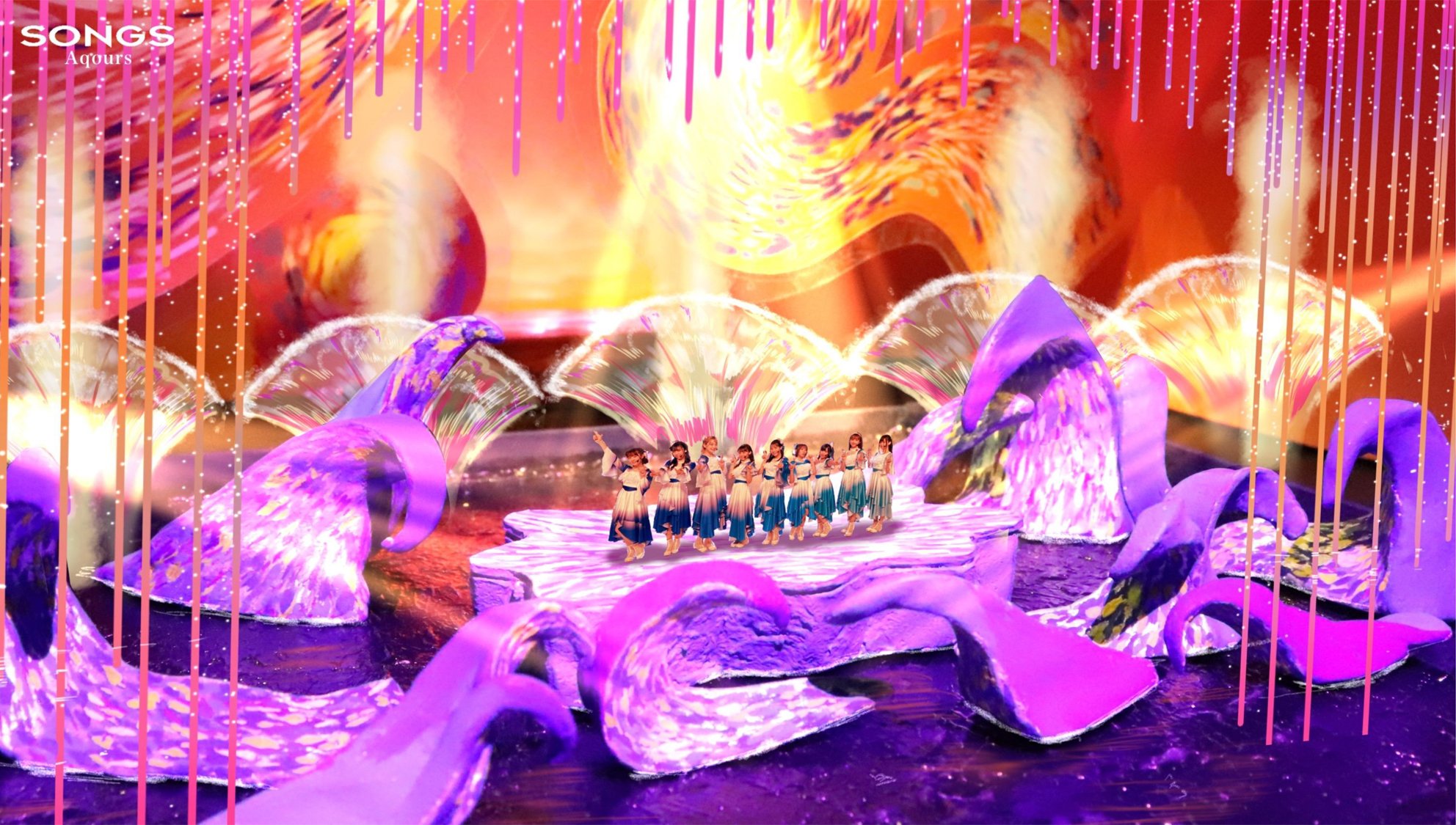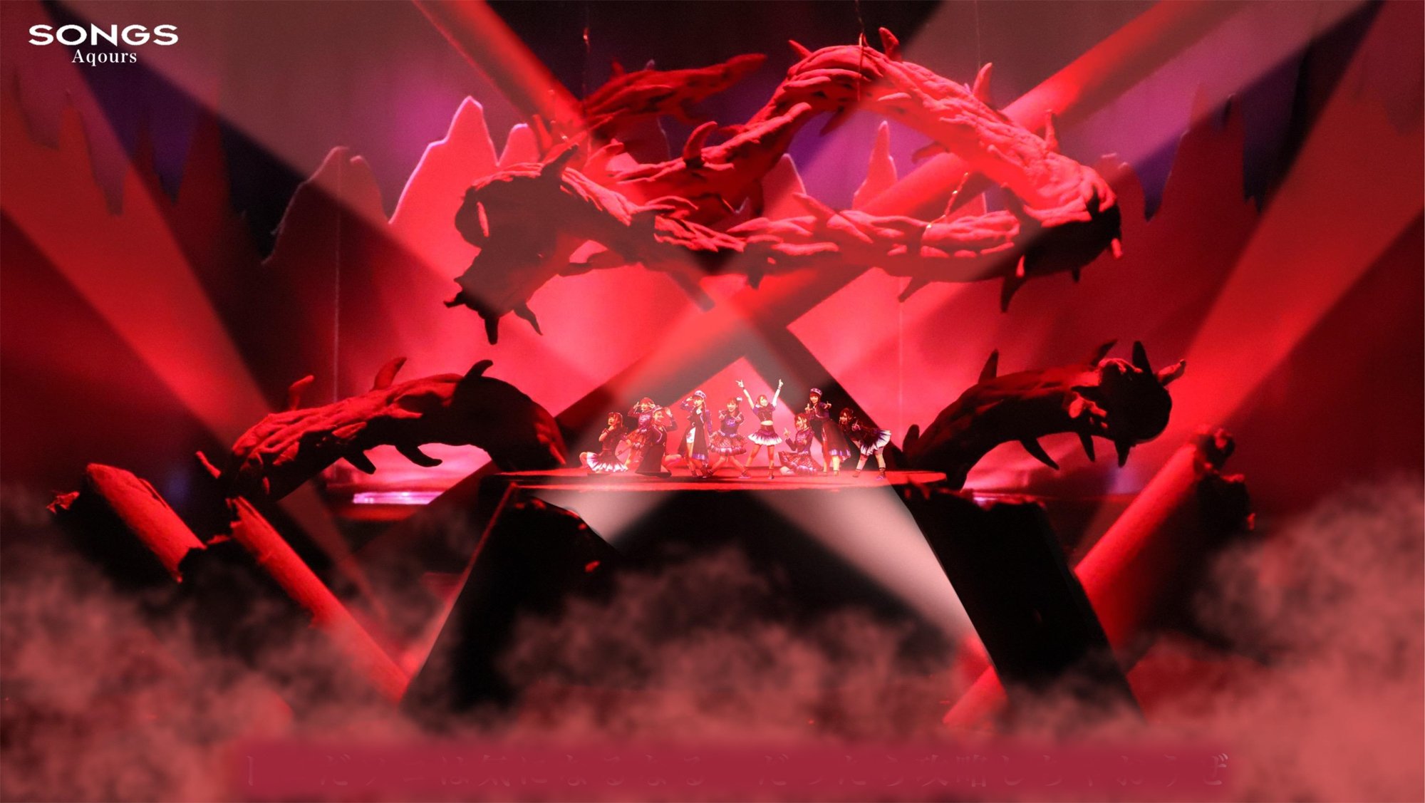 その中で、今回の課題では照明の当て方に苦労しました。前回のトーク番組のセットデザインでは照明で大失敗してしまったので、今回は成功させたいと思っていて。特に2曲目の「Aqours Pirates Desire」は、イバラがあることで、光を当てたときの影の落ち方やコントラストのつけ方など、そのバランスを調整するのが難しかったです。セットも見せたいけれど、いちばんの主役はアーティストなので、それを意識してデザインすることを心がけました。