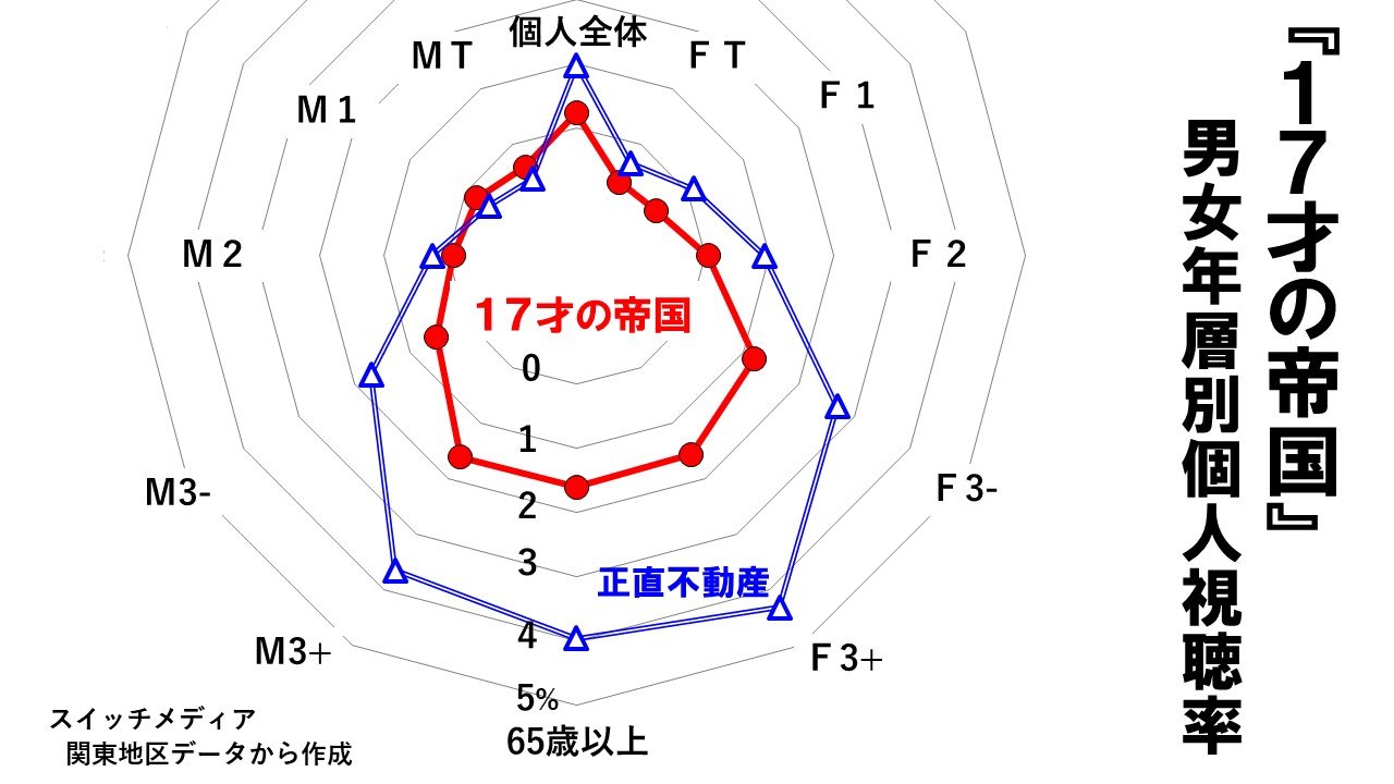 「ニュース7」の65歳以上17%台には遠く及ばない。また大河ドラマ「鎌倉殿の13人」の15~16%からも大きく下がる。夜10時台は起きている高齢者が少ないこともあるが、「正直不動産」の5%ほどに比べ、「17才の帝国」は2.6%しかなく個人視聴率全体を押し下げてしまった。