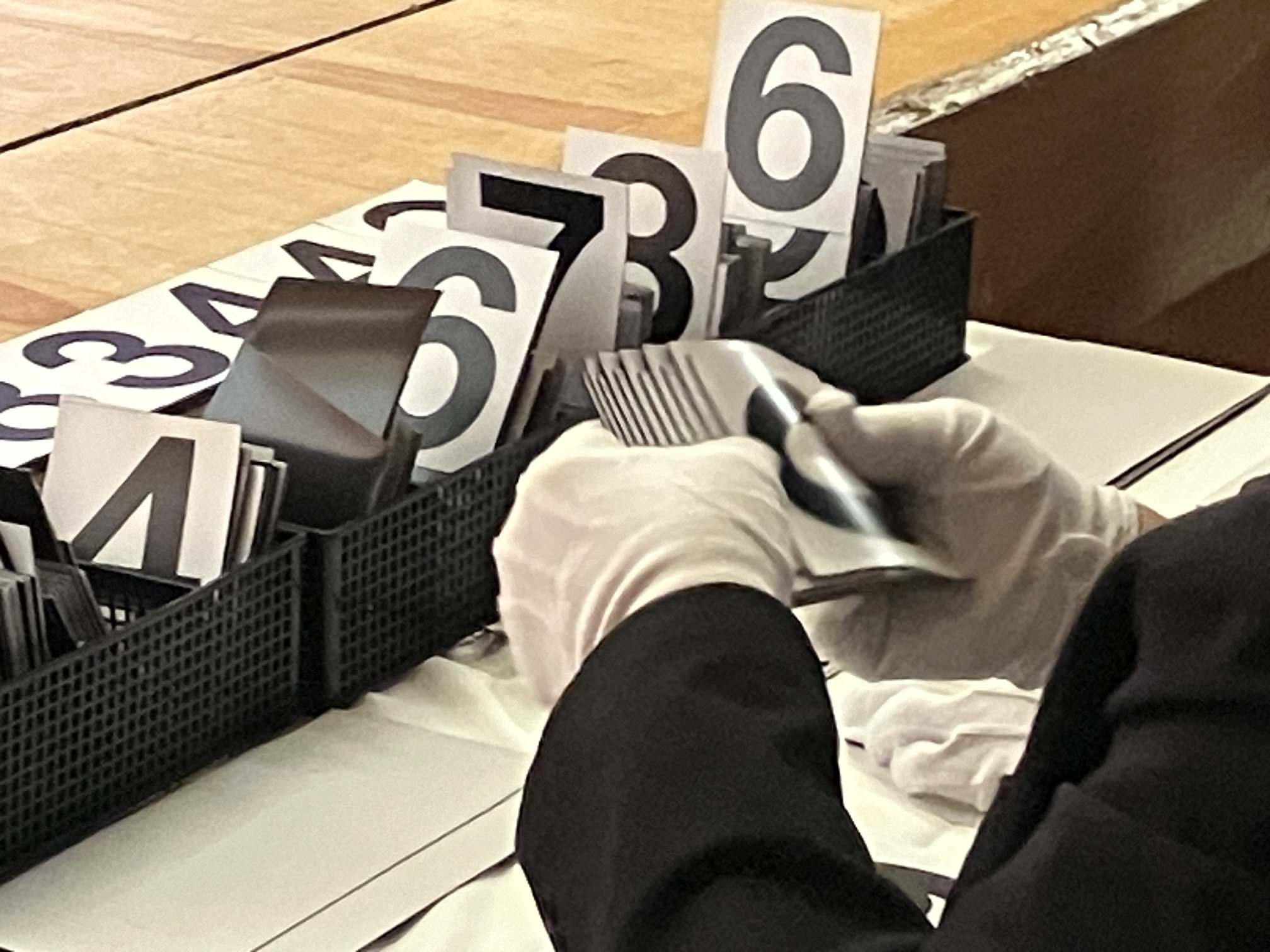 張り出された番号に間違いはないか、そして見やすく張られているか、細かいチェックが続きます。「ほら、上から3列目の数字、左を1ミリ上げて」というようなところまで手を抜きません。
