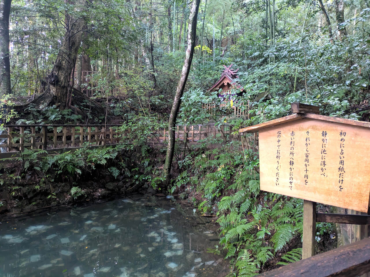 今は授与所で占い用紙を受け、硬貨をのせるスタイル。セツの時代と同じように、早く沈めば縁が早く、遅く沈むと縁が遅く、近くで沈めば身近な人と縁があり、遠くで沈めば遠方の人と縁があるとされています。