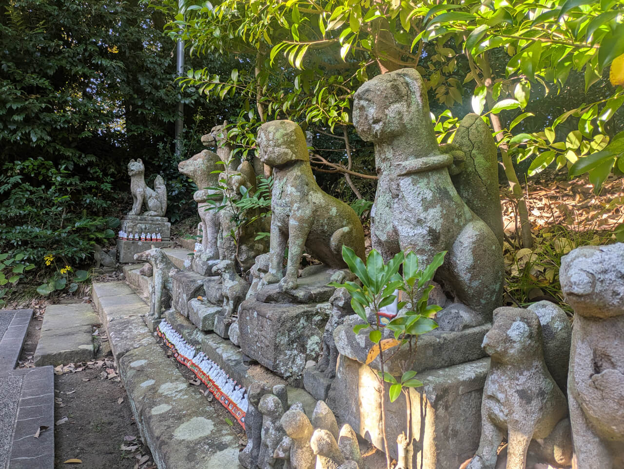 今も参道から御社殿の裏手にまでびっしりと狐の像が並んでいますが、私が幼い頃はさらに多くの狐像がありました。昼間も薄暗く感じられるほど鬱蒼とした境内に石狐が折り重なるように奉納されているさまは、少し怖いほどだったと記憶しています。