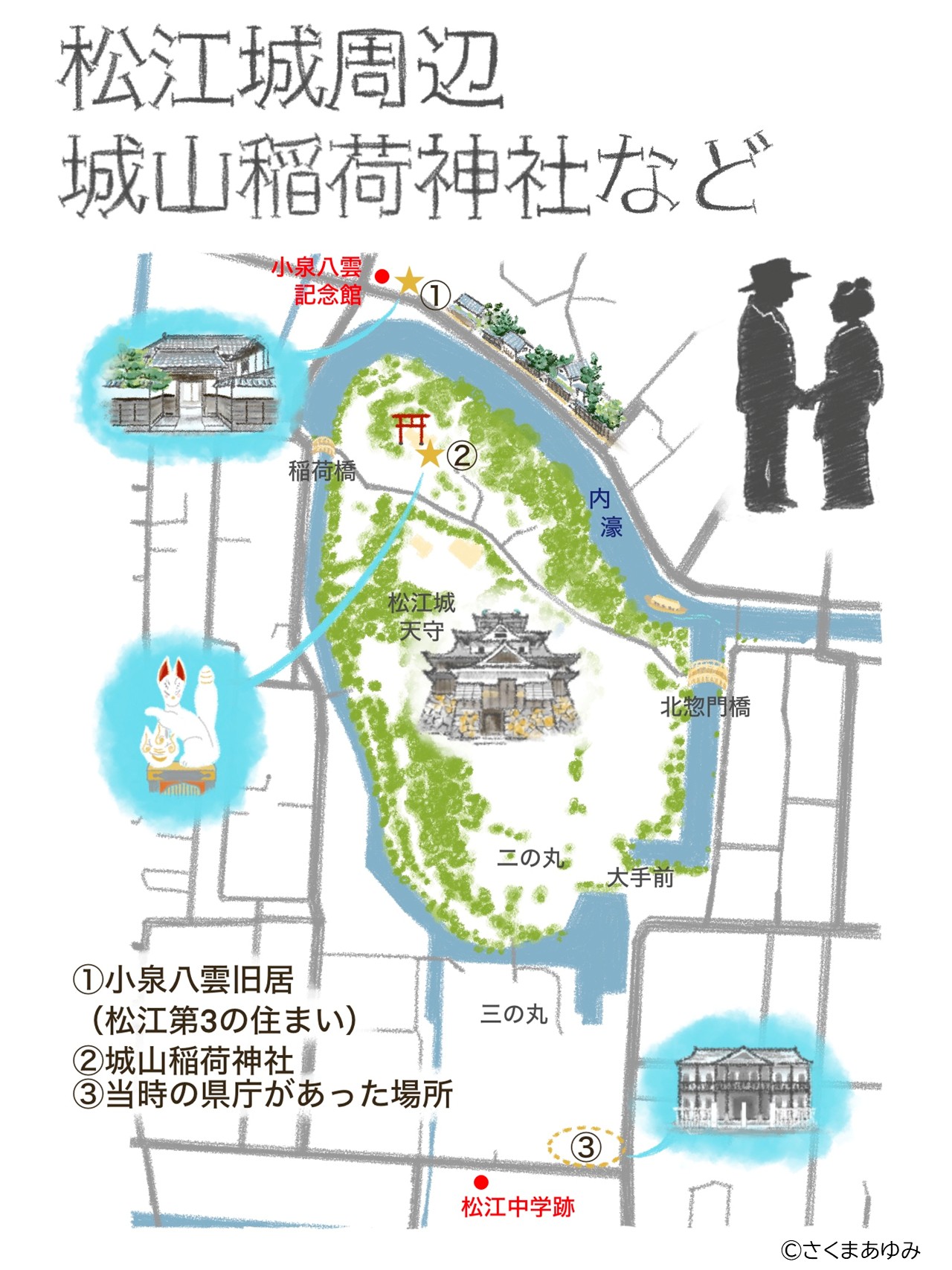 八雲は、内濠沿いにある松江での3番目の住まい(現在の小泉八雲旧居)から城山稲荷神社まで、日常的に散歩に出かけたといいます。