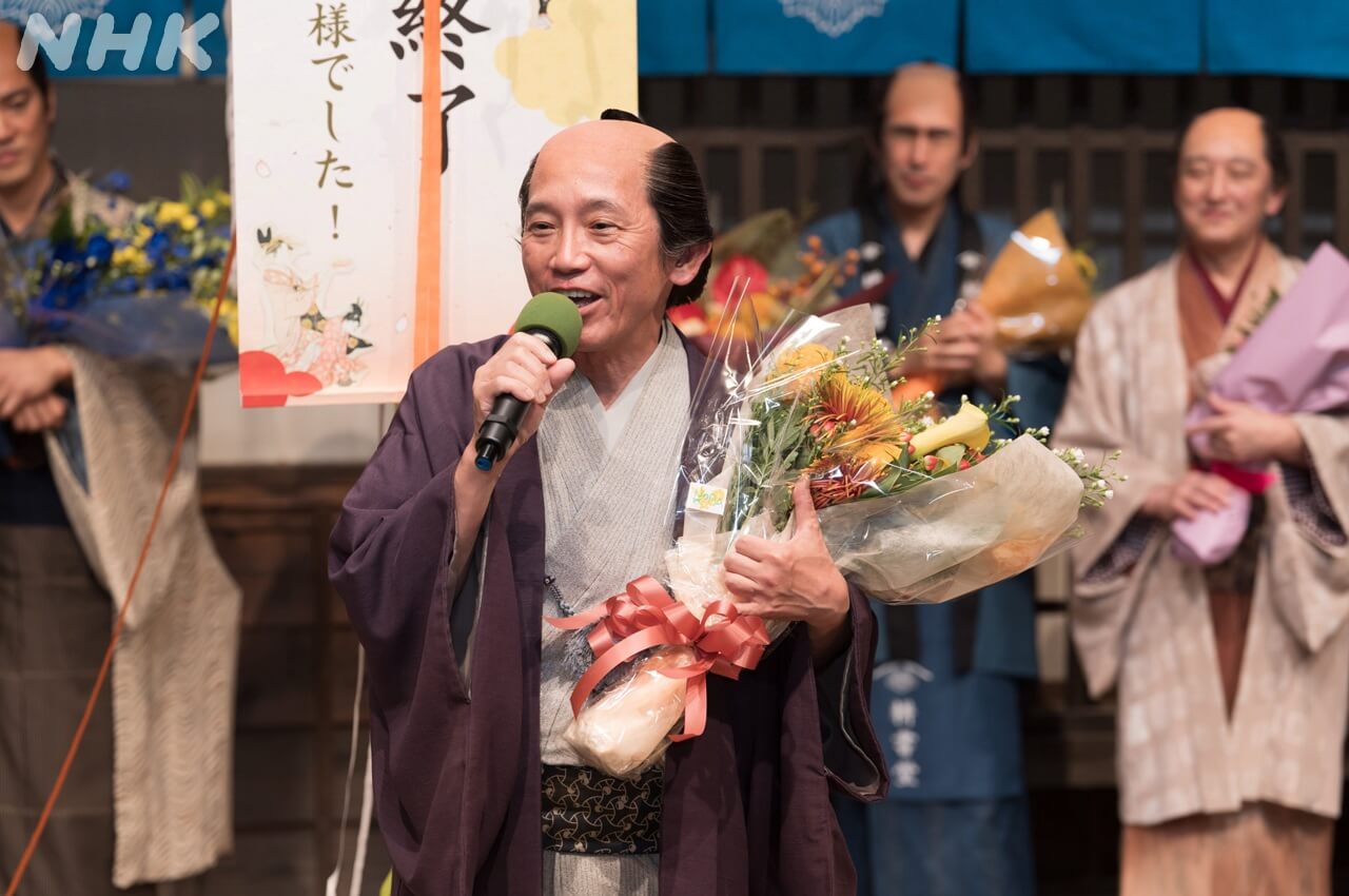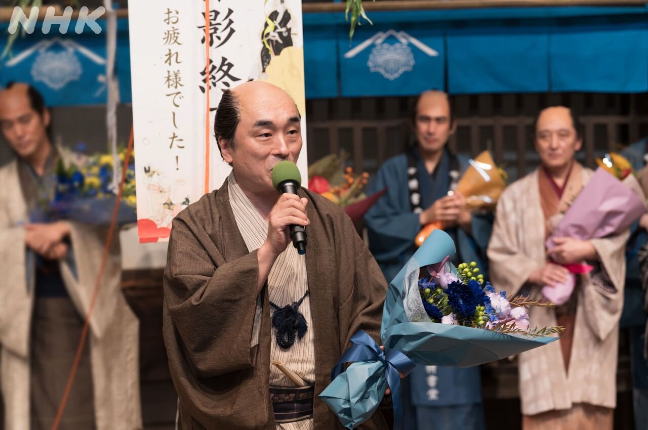 65歳で大河ドラマに初出演、すごく感謝しております。最初は湯屋の主人役で一回だけの出演かなあなんて思っていたのが、頭を丸めて狂歌師の元木網役でまた出させていただきました。皆さん本当に感謝感謝です。流星さんもお疲れさまでした。ありがとうございました。