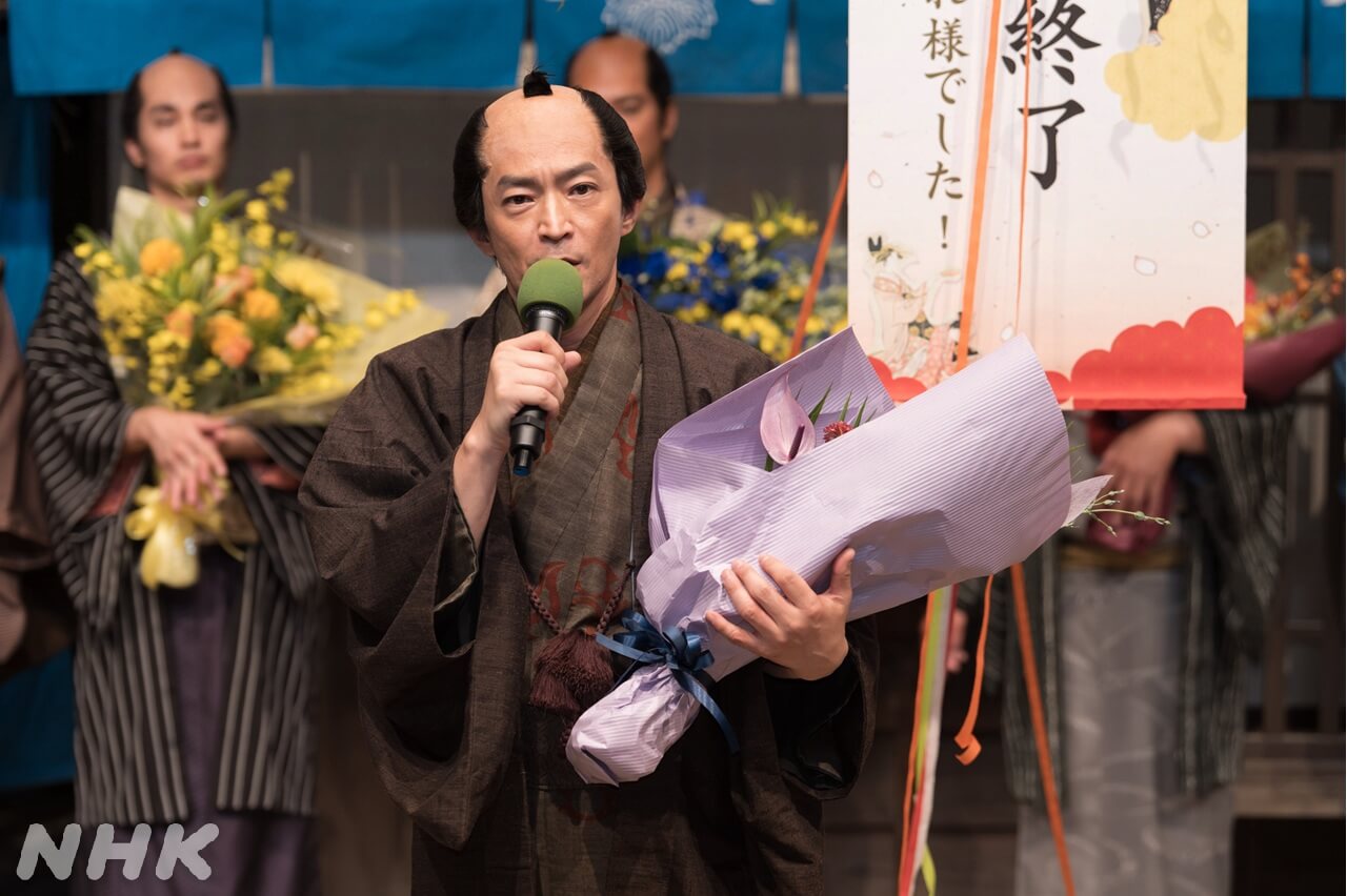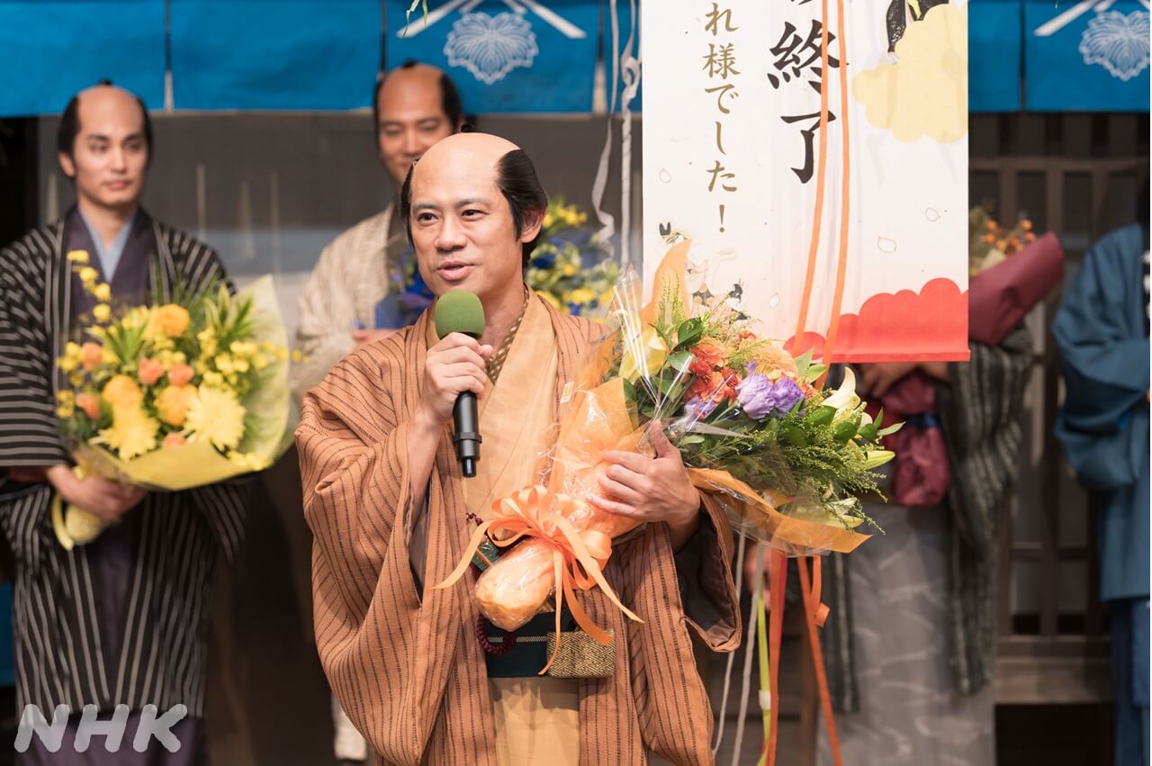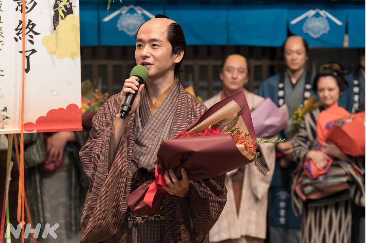 さん本当に本当にお疲れさまでした。無事にクランクアップできたのは、座長、流星くんの「役を生きる」という信念のおかげです。思い返せば、私、じつは最初、カツラの特殊メイクもやっていたのですが、「これ必要あるのか?」ということになって、(半次郎役の)六平直政さんと私だけラテックスなし(頭頂部が地肌)です。そして皆さん、今日クランクアップで花をもらっていい笑顔ですけれども、また呼ばれますよ! 皆さん「べらぼう2」でお会いしましょう。