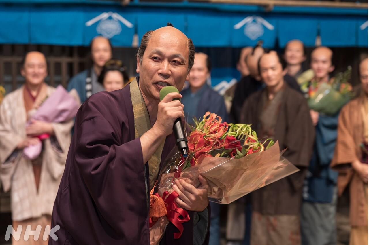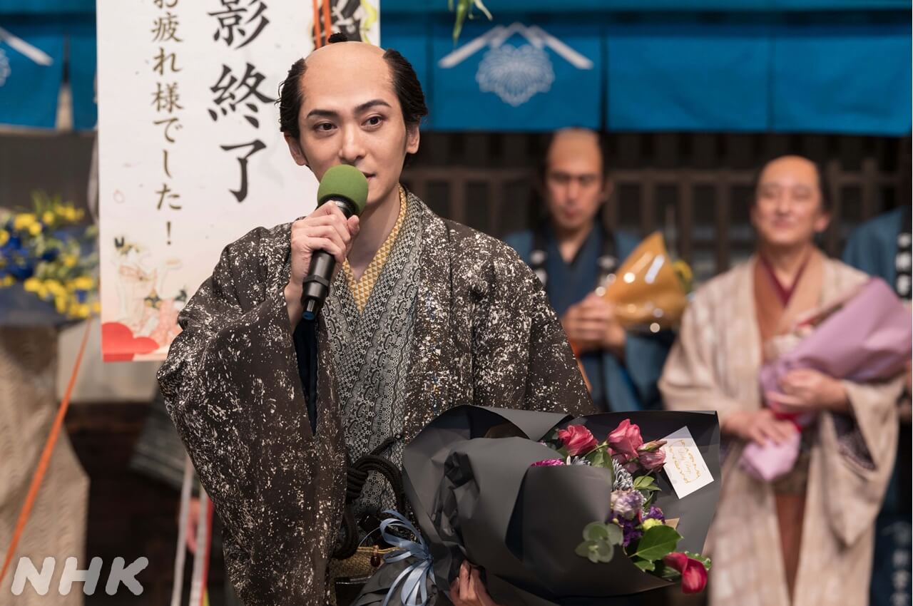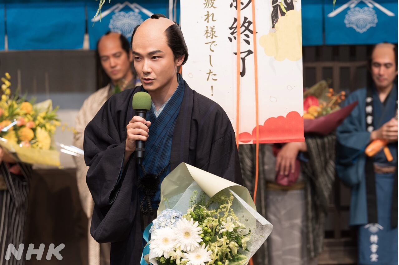 さん本当に本当にお疲れさまでした。無事にクランクアップできたのは、座長、流星くんの「役を生きる」という信念のおかげです。思い返せば、私、じつは最初、カツラの特殊メイクもやっていたのですが、「これ必要あるのか?」ということになって、(半次郎役の)六平直政さんと私だけラテックスなし(頭頂部が地肌)です。そして皆さん、今日クランクアップで花をもらっていい笑顔ですけれども、また呼ばれますよ! 皆さん「べらぼう2」でお会いしましょう。