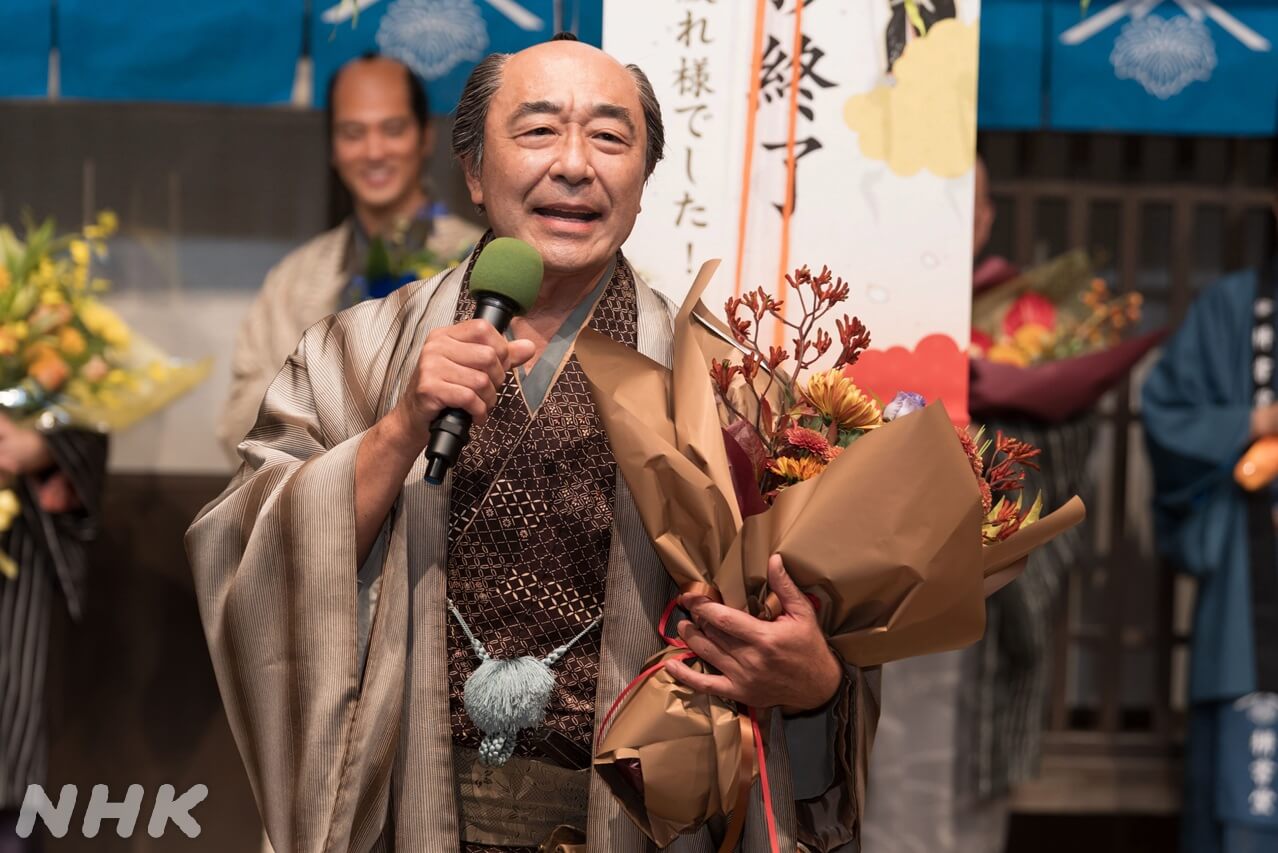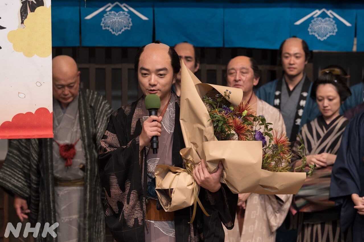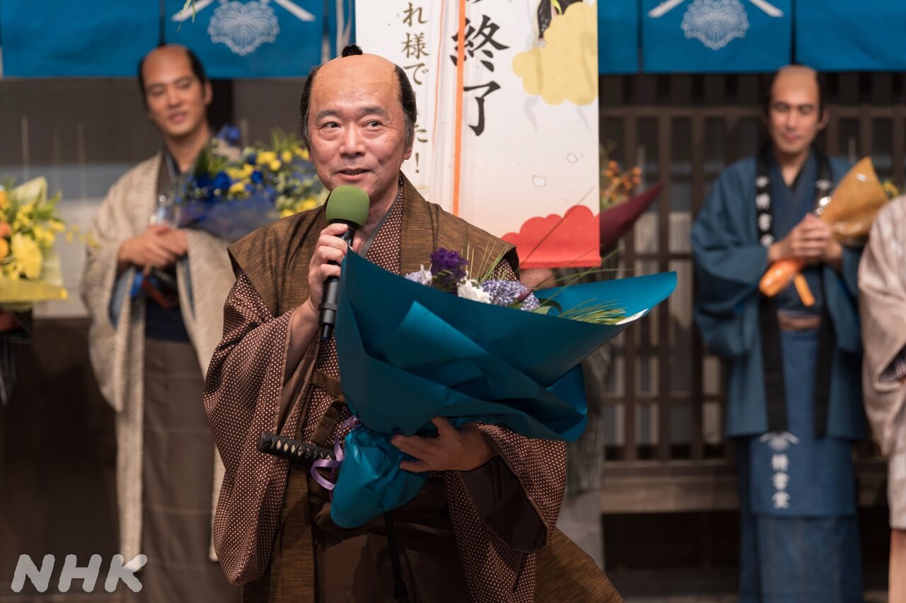 8月ごろですかね、流星くんが耕書堂の撮影のときに何にもない平らなところでつまずいているのを見まして、みんなよっぽど疲れてるんだなってつくづく思いました。それがおとといの撮影のときには、私の前をさっそうと歩く流星くんが。その姿を見てものすごくうれしかったのですが、同時にいよいよ終わるんだなとも感じてちょっと寂しくもありました。そして、(史実の)蔦屋重三郎と扇屋は6歳しか違わないということを知ったのは9月でした。今日のシーンはもう、棺おけに片足突っ込んでるようなじいさんで終わってしまいました(笑)。本当に皆さん約1年半お疲れさまでした。