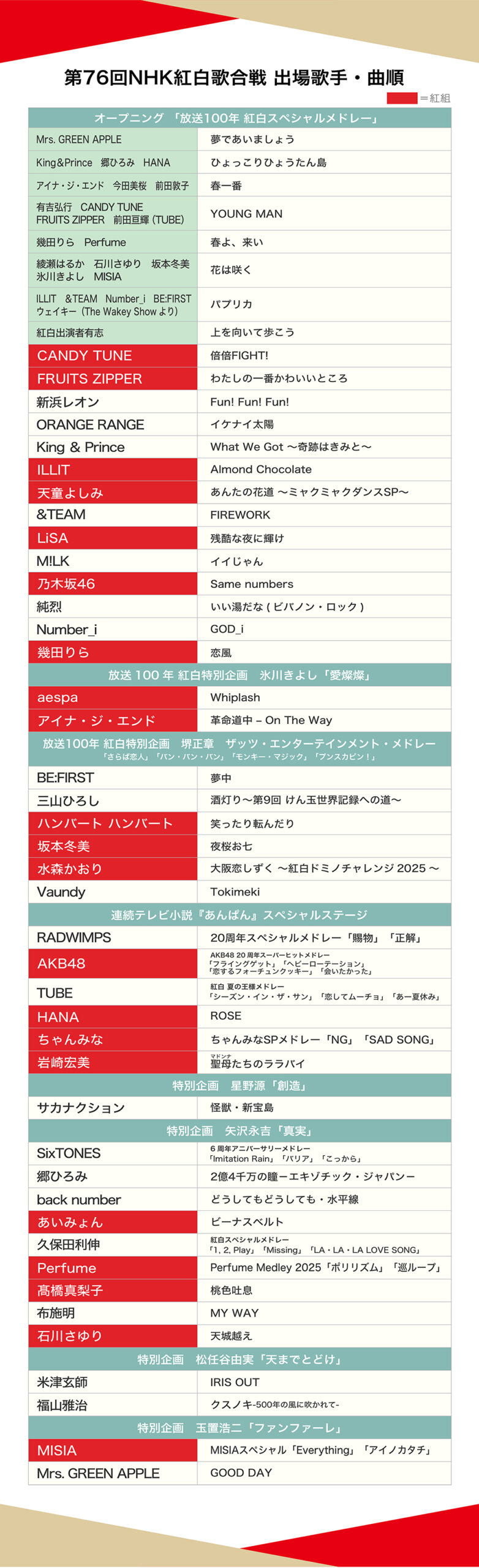 大みそか放送の「第76回NHK紅白歌合戦」の曲順が決定しました。