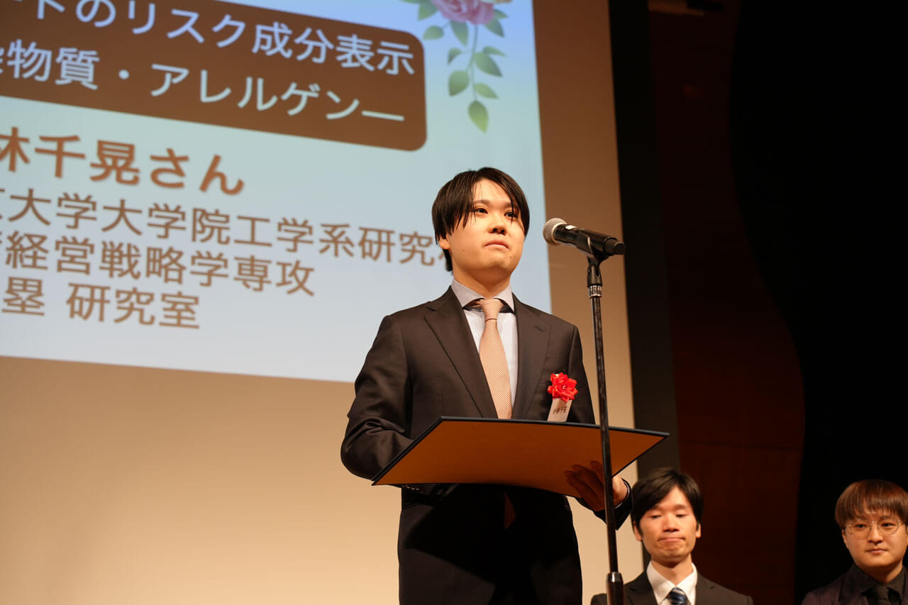 準グランプリ「インフォメーション・フードのリスク成分表示」(東京大学大学院・小林千晃さん)は、文章に含まれる過度なレトリックや誤謬といった情報操作のテクニックを“食品成分表示”のように可視化するアイデアで、危険性を直感的に判断できる仕組みが評価されました。