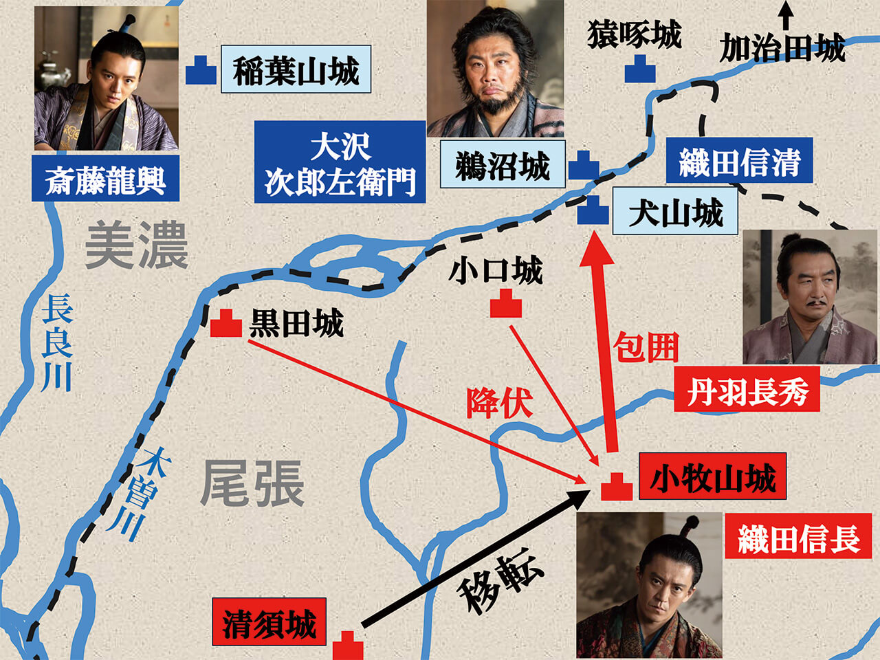 信長が本拠を小牧山に移すと、翌年には犬山城の支城である黒田城(現在の愛知県一宮市に所在)・小口城(現在の愛知県丹羽郡大口町に所在)が降伏します。これは丹羽長秀(演:池田鉄洋)の交渉が大きかったようです。