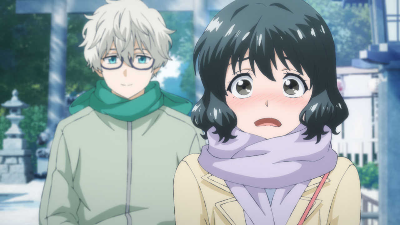 第15話「新しい景色」は、年が改まって、山田くん(山田一郎/声:古川慎)を加えた1年生5人で元旦の初詣に出かけるところから。実は1月1日は、青野くんの誕生日。サプライズでプレゼントを渡す計画でしたが、青野くんが髪を切ってきたことにみんなびっくり。これまで片目しか見せていなかった青野くん(Season2のオープニングで、既に両目見せ青野くんは登場していました)の、大きなビジュアル・チェンジです。
