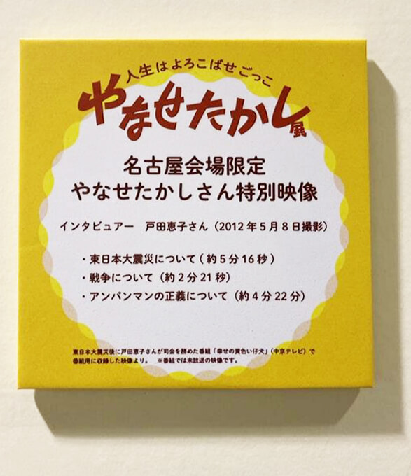 さらに名古屋限定企画として、東日本大震災後に中京テレビで放送された番組「幸せの黄色い仔犬」で、戸田恵子さんがやなせさんにインタビューした際の映像を上映します。番組用に収録されたものの放送にはならなかった部分も含まれていて、ここでしか見られない貴重な映像です。やなせさんの創作の背景や思いにより深く触れられる機会となっています。