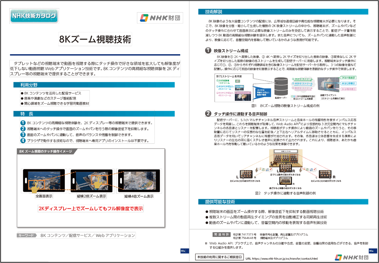 「NHK技術カタログ」とは、NHKが保有する技術シーズの中から提供可能な技術を1件ごとに2ページにまとめたリーフレット集で、技術内容の解説や利用分野、関連する特許などを図も使いながら分かりやすく紹介しています。中でもよくお問い合わせをいただく技術は、「NHK技術カタログピックアップ」として図解中心にまとめて作成しています。(NHK技術カタログ | NHK財団)(ステラnetを離れます)