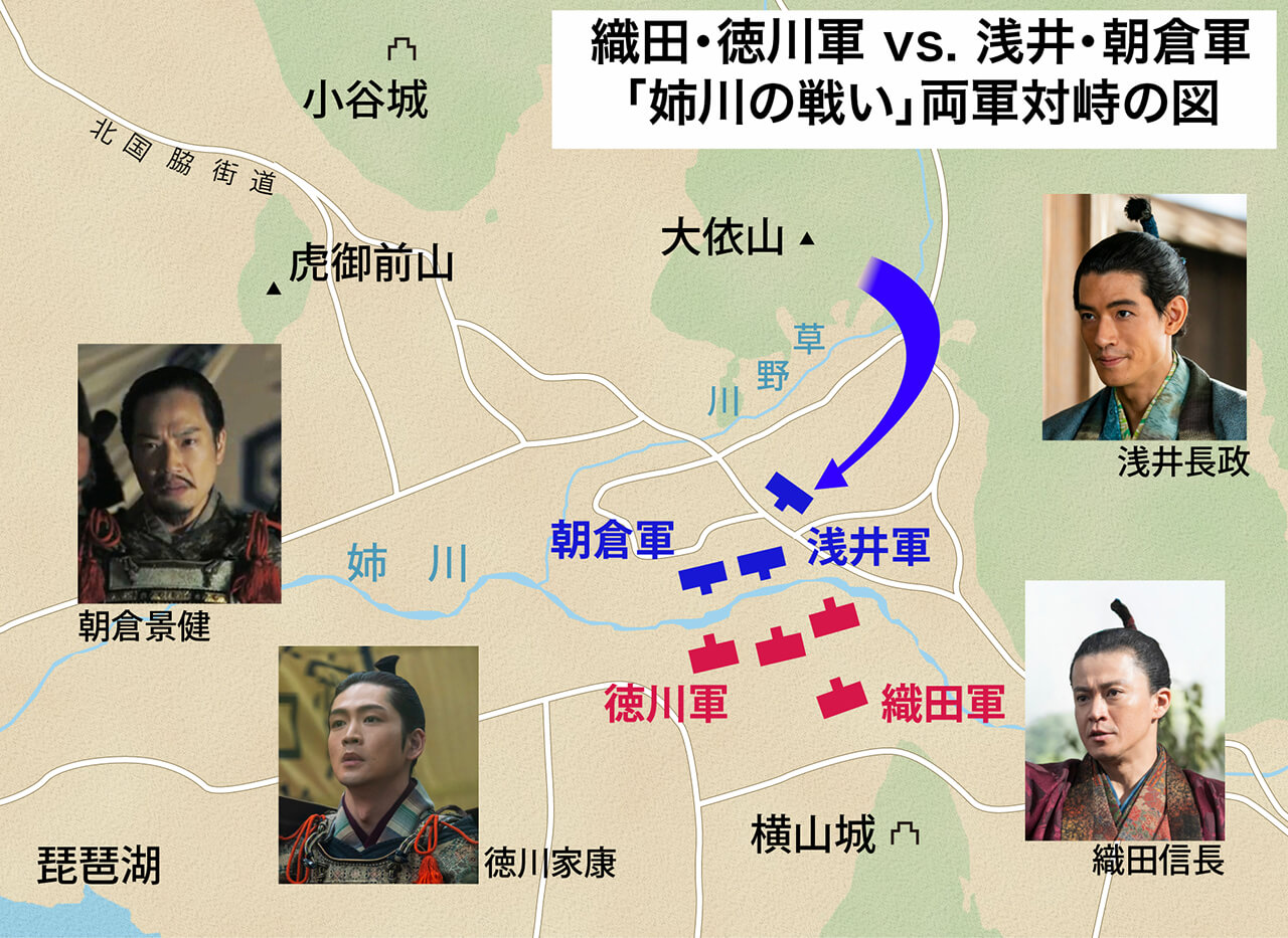 やがて義景から派遣された朝倉景健(演:重岡漠)軍が到着し、大依山(現在の滋賀県長浜市)に陣取りました。ここは姉川を挟んで横山城から5㎞ほど離れた山です。長政も小谷城を出て大依山に陣を構え、横山城の援護を試みます。