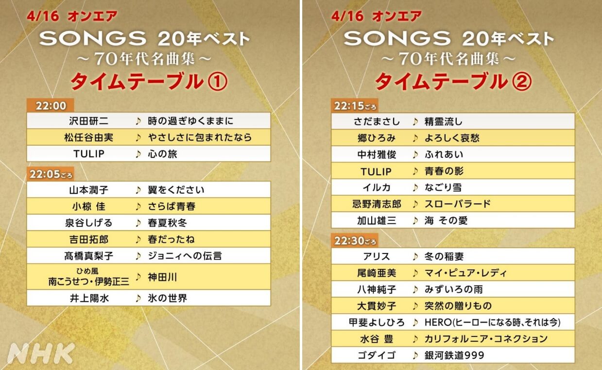4月16日(木)午後10時からの「SONGS」は、「SONGS 20年ベスト~70年代名曲集~」を放送する。20年目を迎えたSONGSの過去のパフォーマンスの中から、70年代に発表された名曲を厳選! その曲目やタイムテーブルを紹介する。