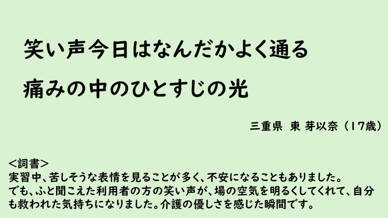 過去の入選作品には、切実な思いを詠んだ歌から、ユーモアに富んだ歌まで、「介護」という共通のテーマがありながら、さまざまな味わいのある作品がたくさんあります。