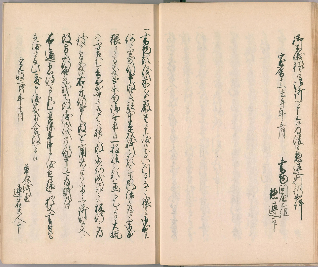 10月には、風俗のためによくない出版物、あるいは猥雑な内容の出版物を禁じるとともに、地本問屋仲間の行事(検閲係)が改を行うよう町奉行からの申し渡しがあり、さらに同月27日にも行事が改を行うよう、同じく町奉行から仰せがありました。そして、この仰せ渡しの本文に続いて、地本問屋仲間を結成した20軒の地本問屋たちの名があります。