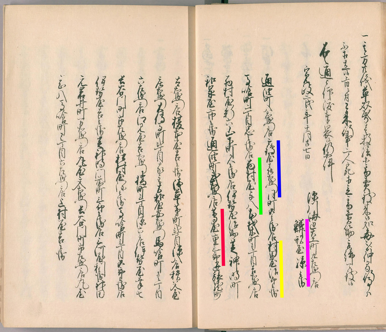 版元の連名の中には、鱗形屋孫兵衛(ピンク線)、鶴屋喜右衛門(青線)、村田屋次郎(治郎)兵衛(黄線)、西村屋与八(緑線)、蔦屋重三郎(赤線)が見える。※色線は編集部