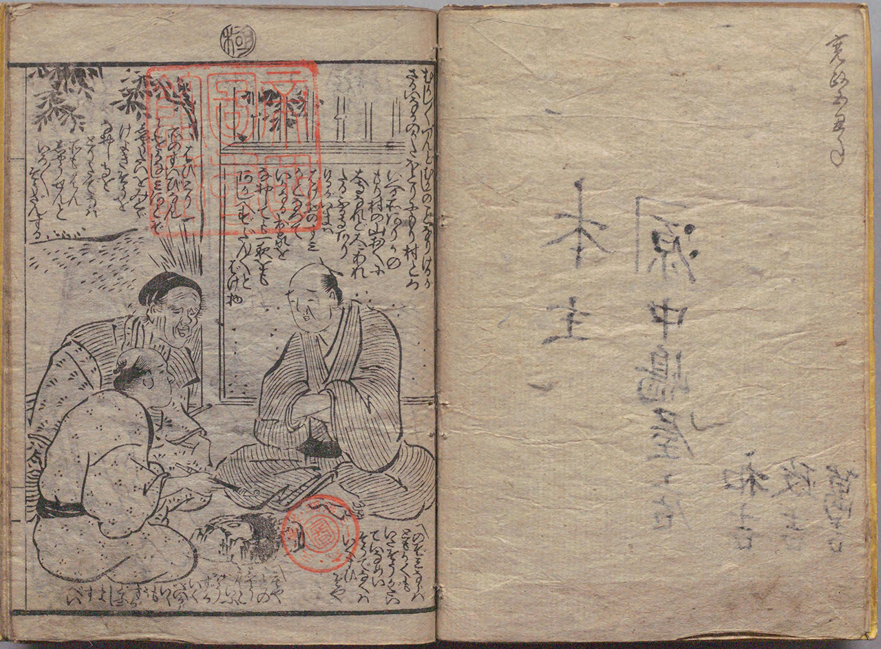 さらに11月、江戸の町年寄より、地本の改の手順が具体的に示され、新たに出版するものについては、草稿の段階で、地本問屋仲間の行事の改を受けることとなりました。これにより、その後に出版される浮世絵の画中、さらには寛政3年正月出版の黄表紙の一部についても、題簽(表紙に貼る書名などを記した紙片)、あるいは巻頭や巻末に「◯に極の字」の印が見られるようになります。これが、行事の改を受けたという印で、改印と呼ばれています。