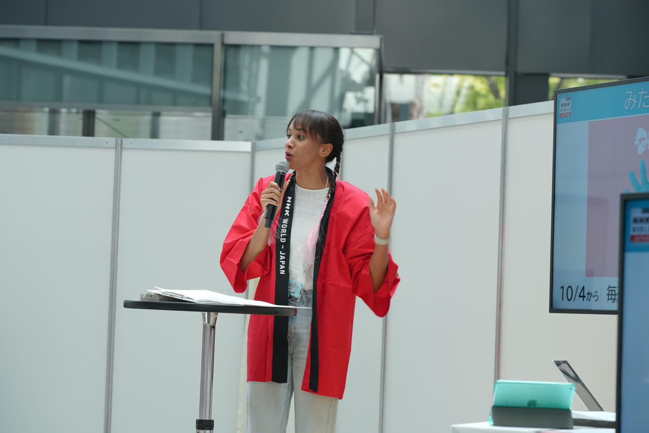 「みたてるふぉーぜ」のほかにも、「おはなしのくに」や「デザインあ neo」など、英語版が用意された番組が多数あり、アプリなどを通じて観られることを伝えました。