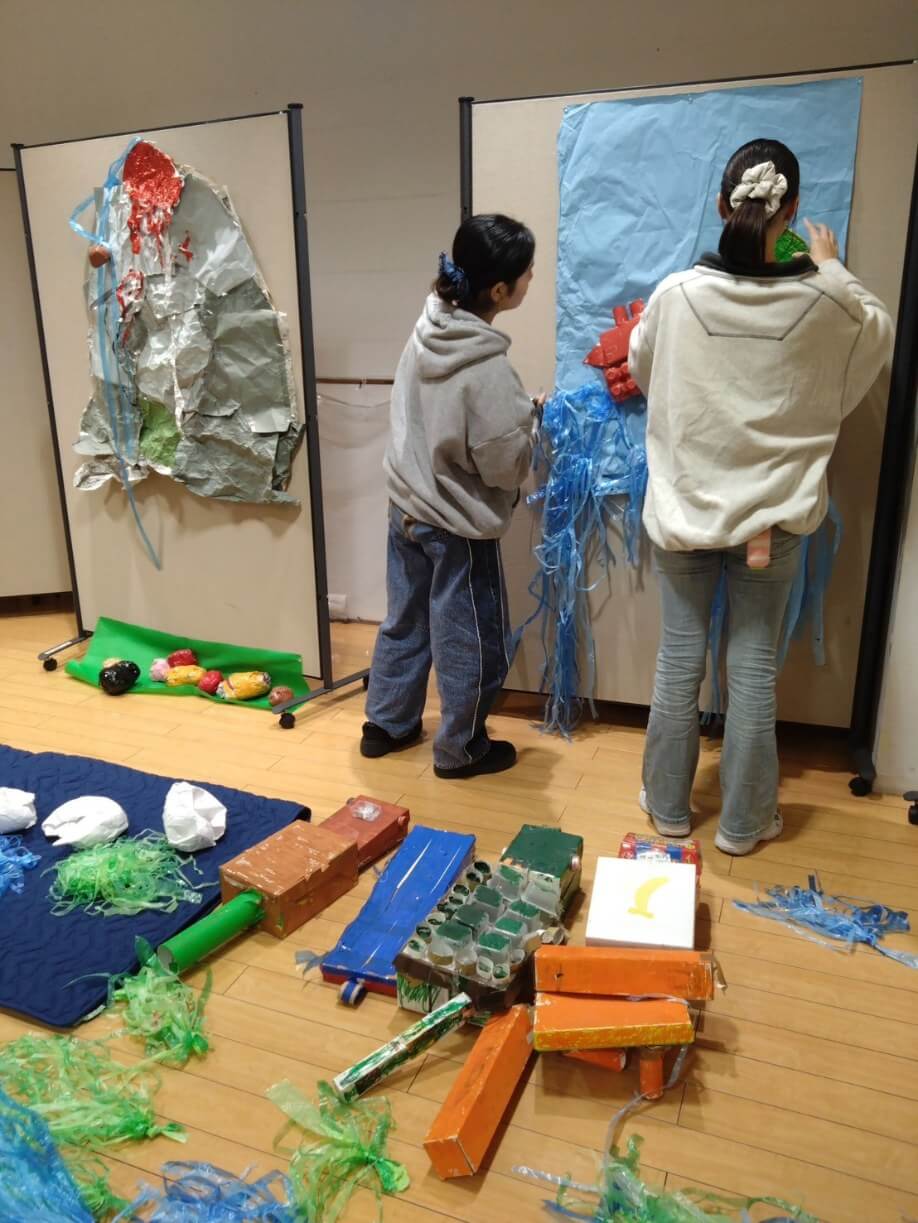 「柏幼稚園」の園児たちが力を合わせて制作した『くじゃく』は、必見の作品です。展示準備の際には、流通経済大学の学生たちが手伝いに訪れ、それぞれの意見を交わしながら、作品の置き場所を右へ左へと工夫して展示してくれました。