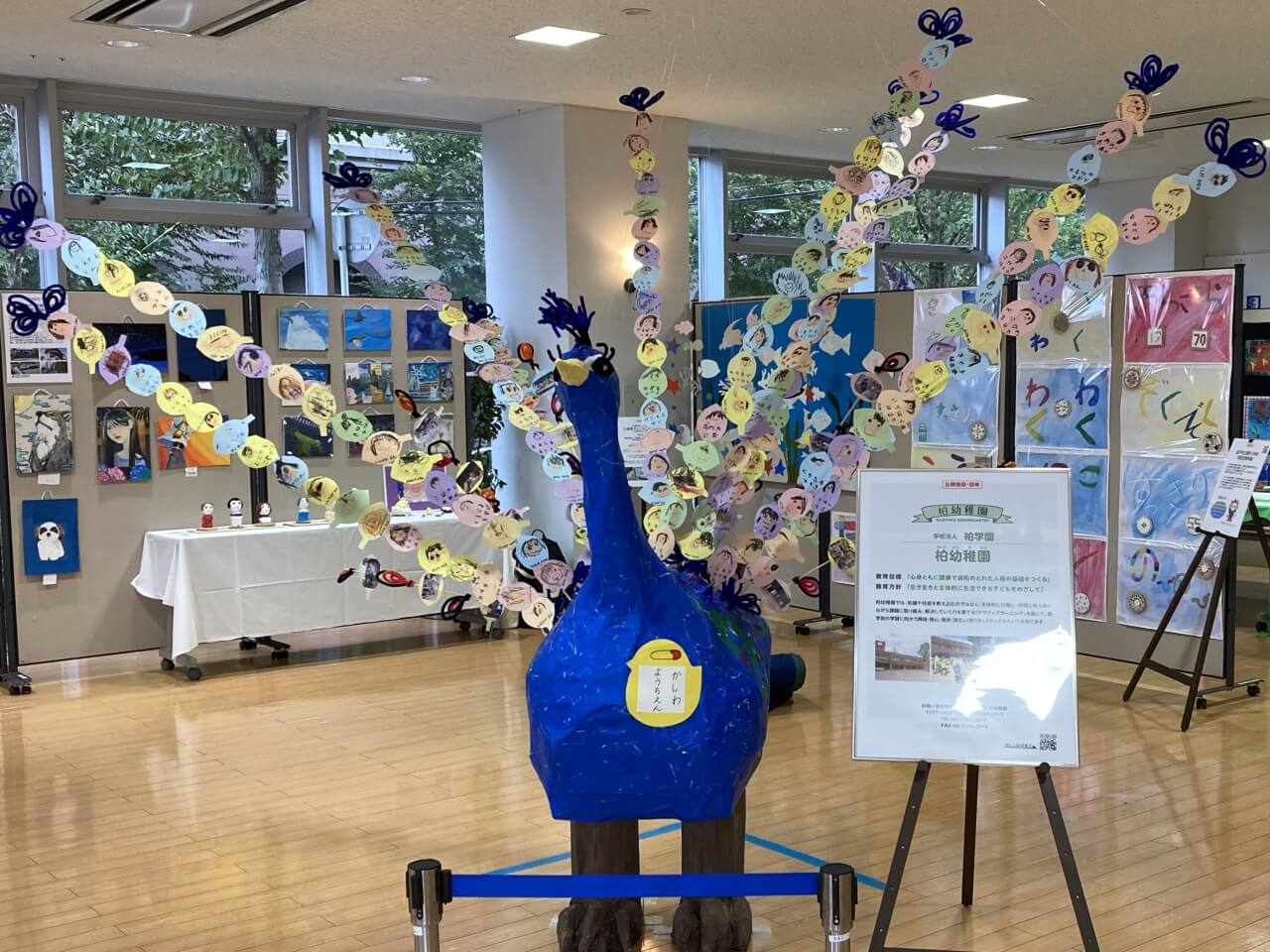 くじゃくの胴体の青い部分は、園児たちが一枚一枚、青色の折り紙を丁寧に貼り付けて仕上げたものです。羽の部分も、園児たちが思い思いに絵を描いて彩りました。大学生と地域が協力し合い、心を込めて作り上げた展示です。