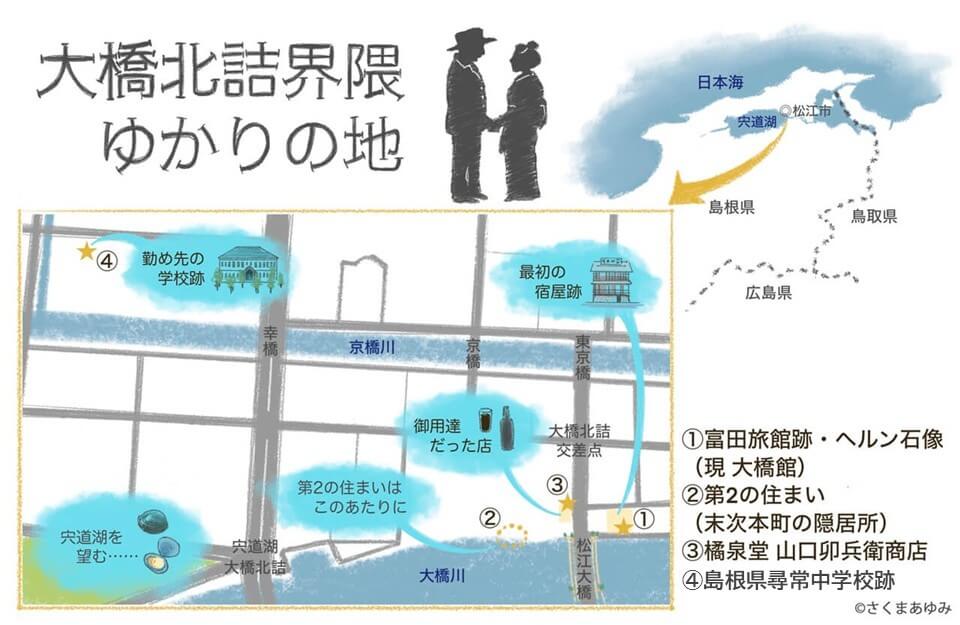 今回は小泉八雲(ラフカディオ・ハーン)が実際に松江での生活をスタートさせた宿屋「富田旅館」と、転居先となった第2の住まい、そしてセツと八雲御用達の薬舗をめぐりましょう。
