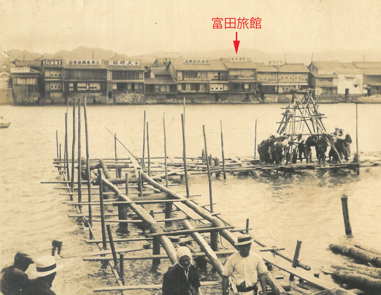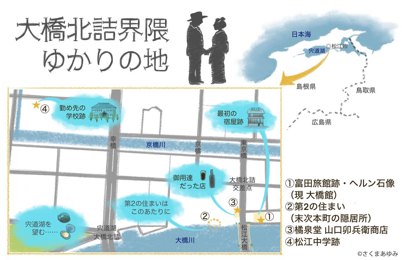 松江では「へルン先生」と呼ばれた小泉八雲(ラフカディオ・ハーン)。明治23(1890)年の8月、松江に来て最初の投宿先となったのが富田旅館。松江大橋北詰にある小さな宿でした。