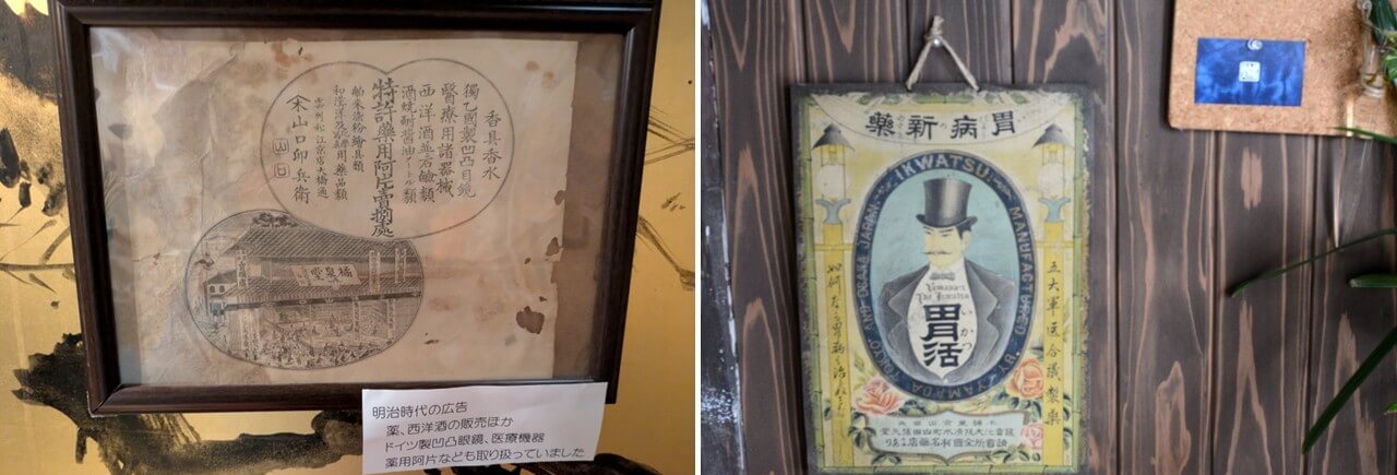 創業は安永元年(1772)。今年で253年の歴史を刻む薬舗は、八雲が松江に滞在した当時は4代目が店を取り仕切り、松江では希少な舶来物を扱う商店として繁盛していました。取り扱うのは医療機器にドイツ製凹凸眼鏡、写真用の薬品、香水に石鹸、染粉や絵の具、洋酒にバター、ビスケットなどの食品類。もちろん、ビールも!