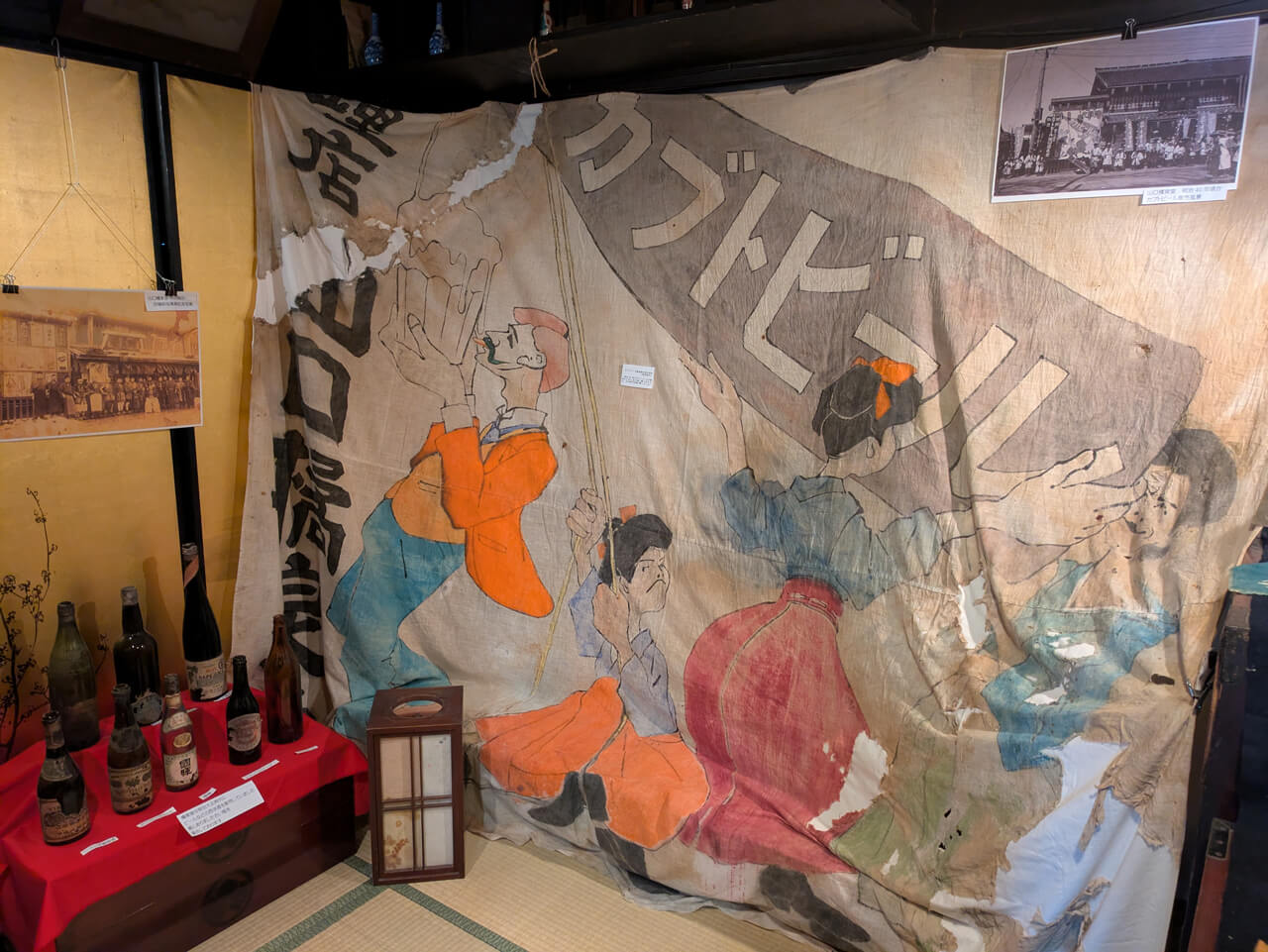 私が訪ねた時は、八雲が飲んだであろうビールにちなんだものが所狭しと展示されていました。思わず笑ったのが、大きな布に描かれたビールの看板絵。左端に八雲を思わせる西洋人男性がグラスを掲げています。当時の松江人にとって、西洋といえばヘルンさん! だったのかもしれません。