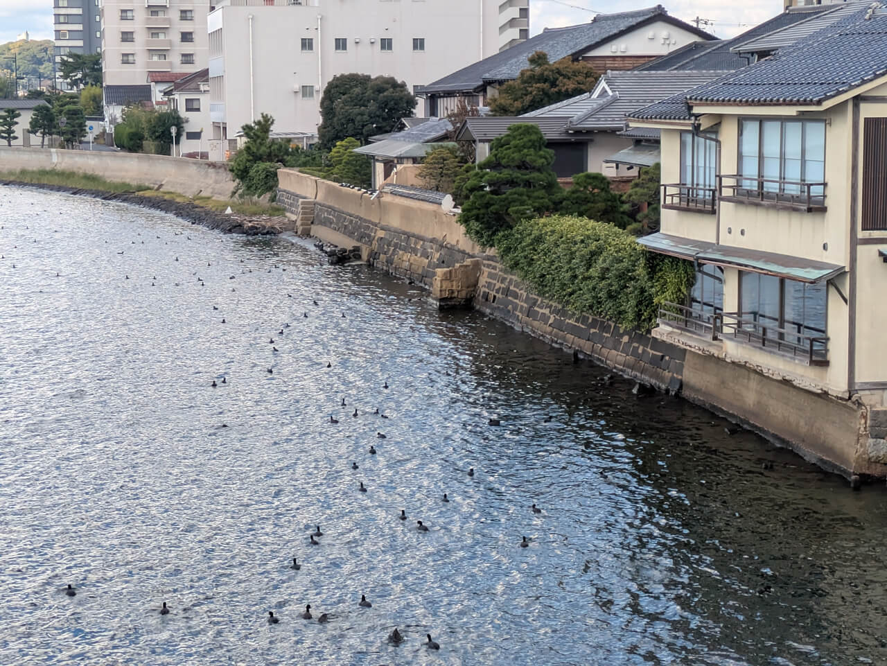 茶室の研究者として知られる工学博士・岡田孝男の『松江の茶室 付 小泉八雲旧居』には、当時の富田旅館は2階建てで、南は大橋川に掛け出してつくられており、北の道路側に出入口があったと記されています。八雲の居室としてあてられたのは2階の北側4室と南側の1室。南側の1室を展望室とし、大橋川や宍道湖、松江大橋の眺めを楽しむため、南北の部屋の間にある屋根上の物干し台を伝って移動したのだとか。