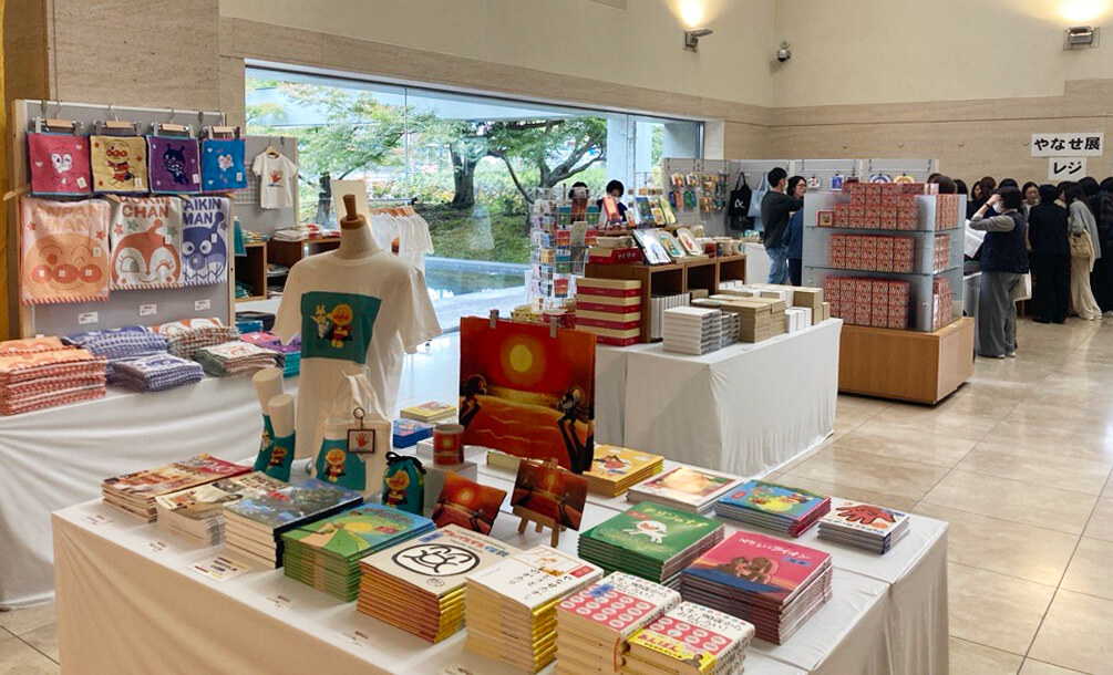 物販コーナーでは、オリジナルグッズを多数取り揃えています。「アンパンマンとやなせうさぎ」をはじめ、展示作品の絵柄をあしらったTシャツ、トートバッグ、マグカップ など、バリエーション豊富なラインアップです。吹き抜けのエントランスで、広々とした空間のなか、ゆっくりとお買い物を楽しめます。展示で感じた温かい気持ちを、やなせさんの絵とともに持ち帰ってはいかがでしょうか。