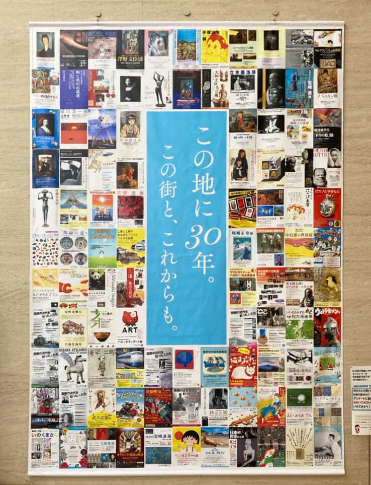 館内には、過去の展覧会ポスターをコラージュした大きなタペストリーも展示されています。20年前の「やなせたかしの世界展」ポスターもありますよ。探してみてください。