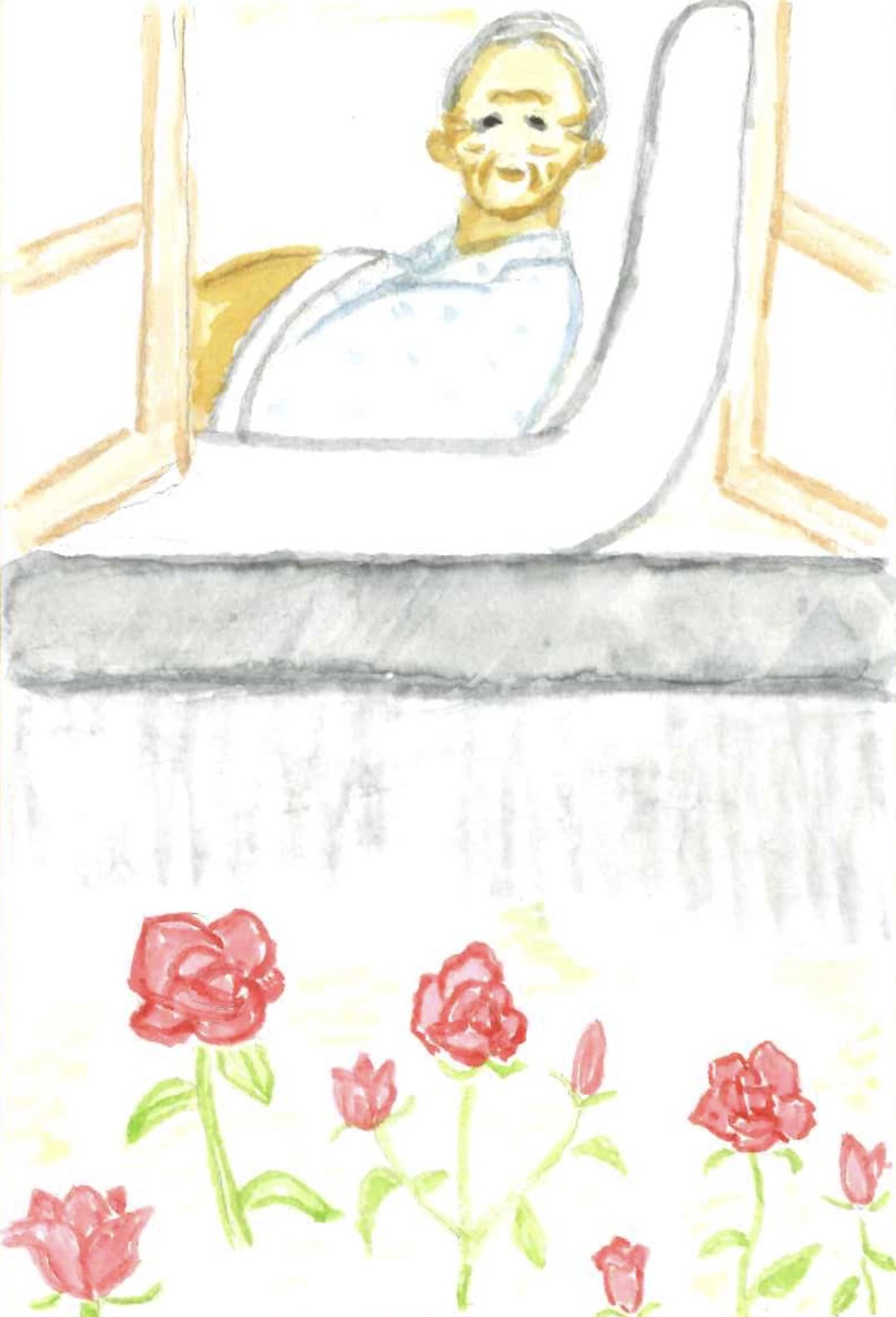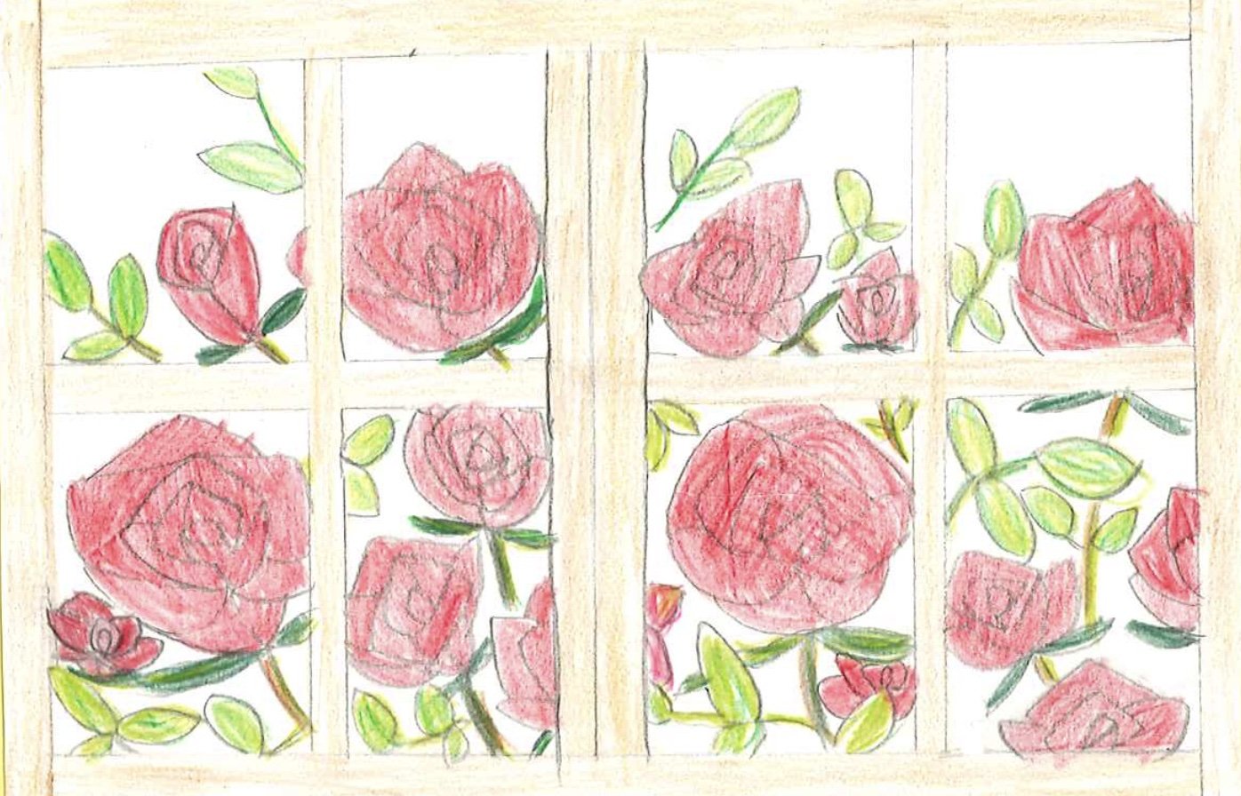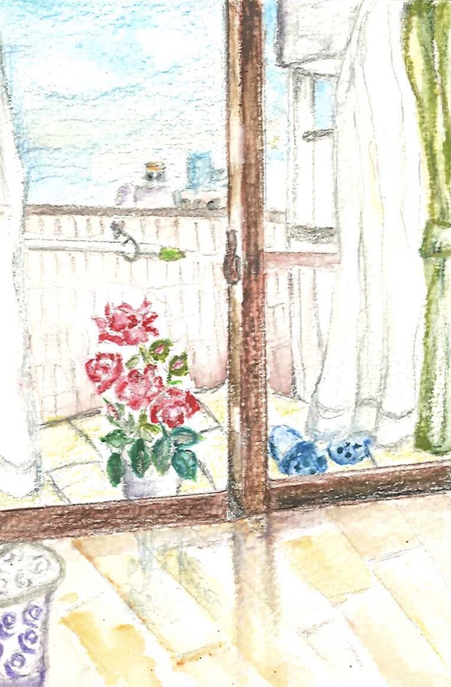 ケアハウス 此処が私の 現住所 窓越しのバラ 真っ赤に咲いた