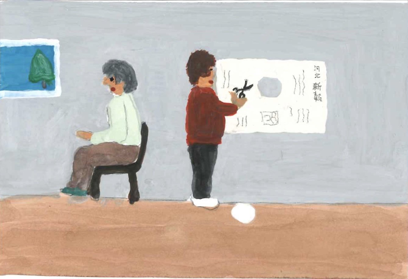 介護の中でも床屋はやっかいなもの。妻が新聞紙の真中に穴をあけて私がてるてる坊主の様に頭を出す。それで介護床屋完成。