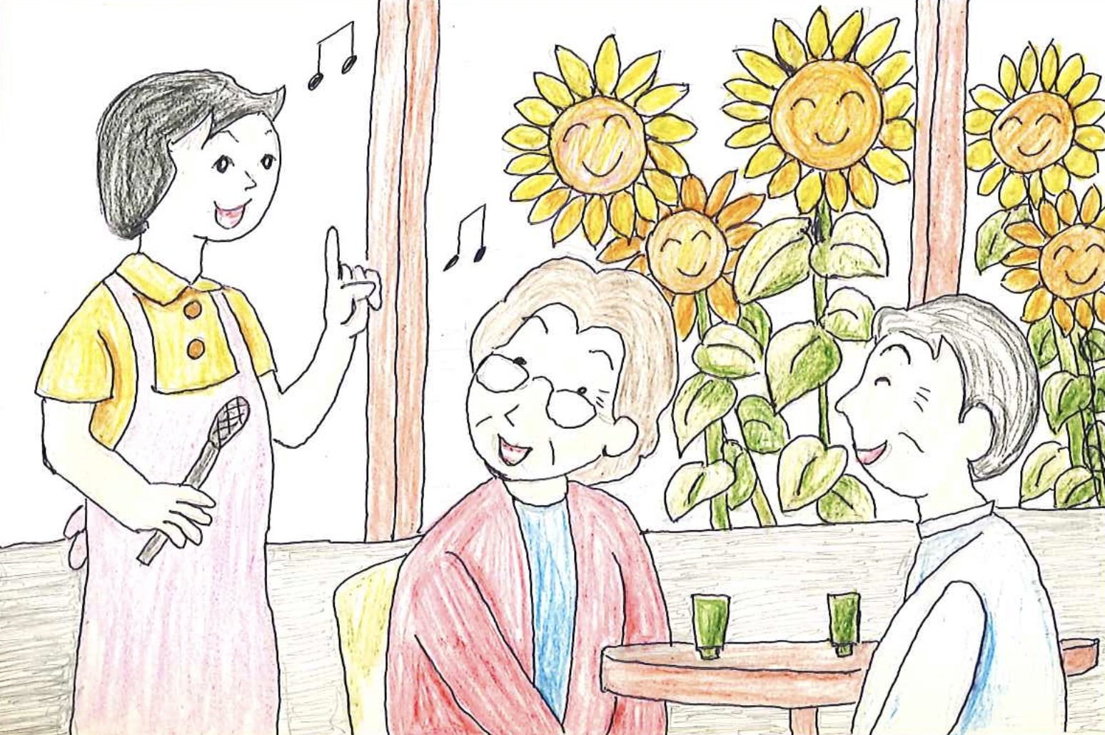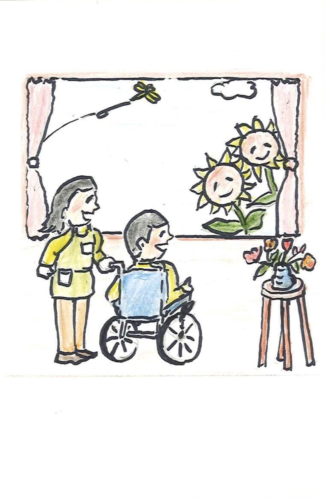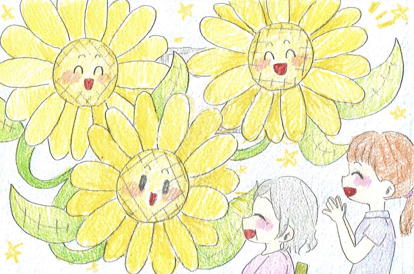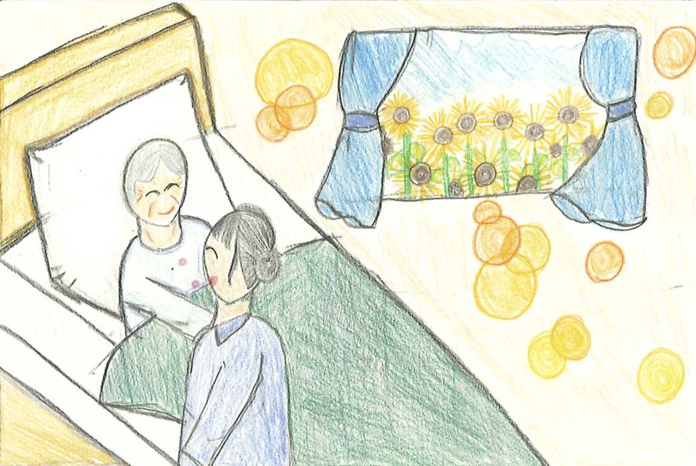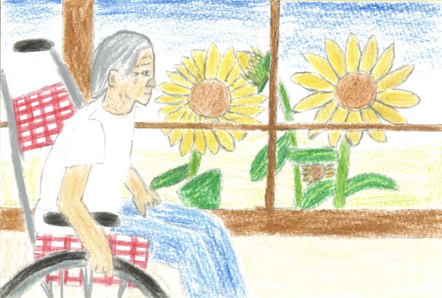 コロナ禍で、利用者様の部屋の空気入れ替えをこまめにしています。庭のひまわりが、私たちを見守ってくれています。