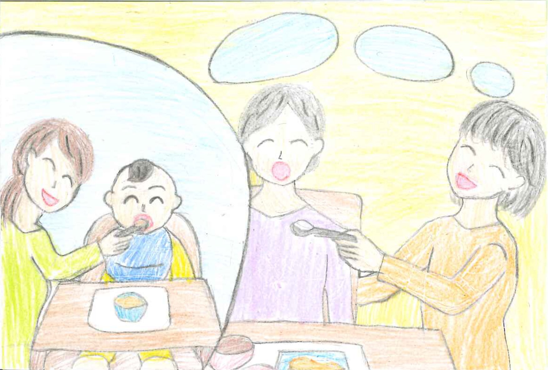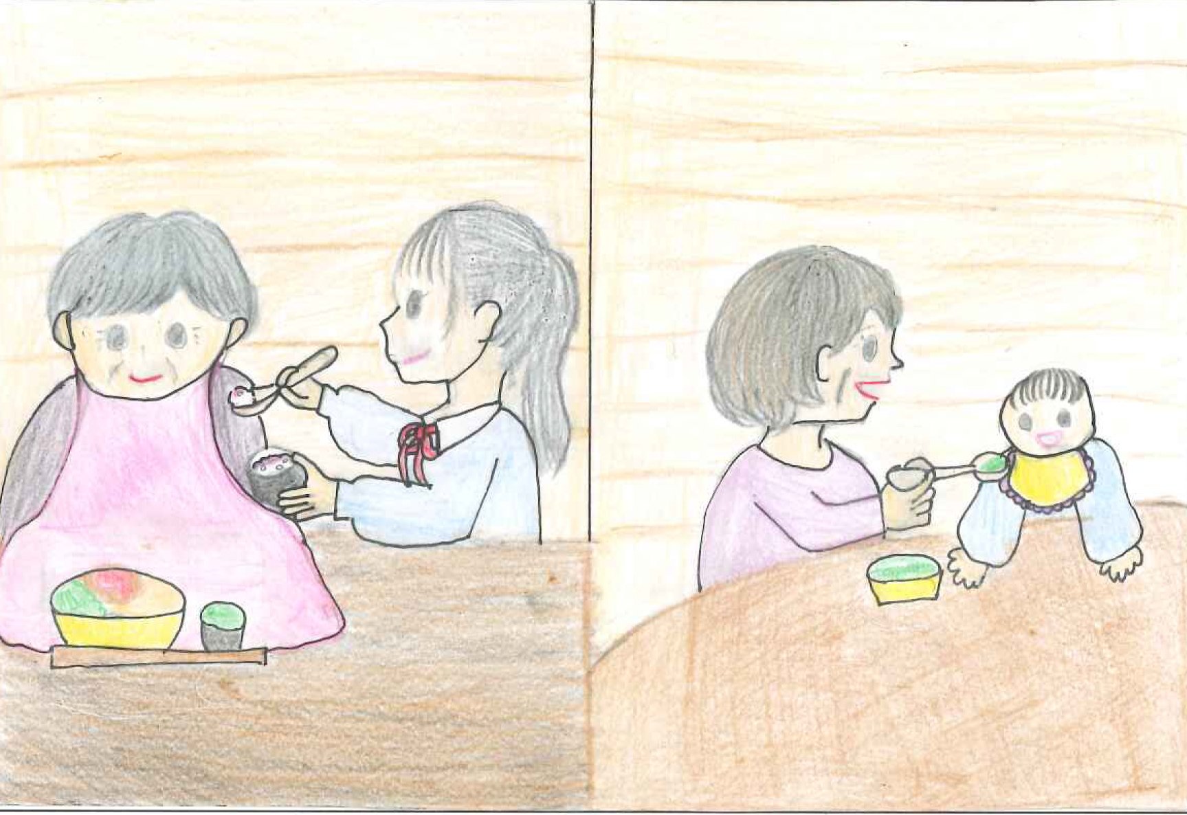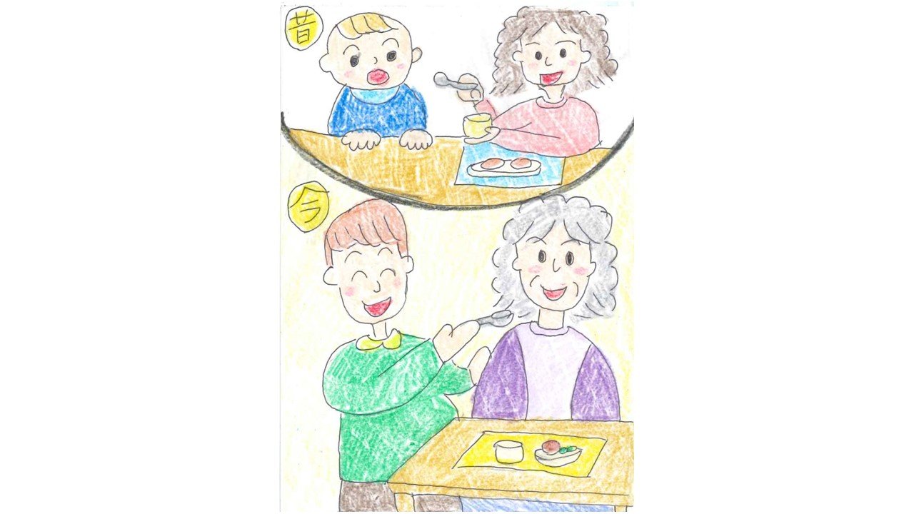 私が小さい頃に、祖母が離乳食を食べさせてくれていたが、今は私が祖母の口にスプーンで食べさせてあげている。