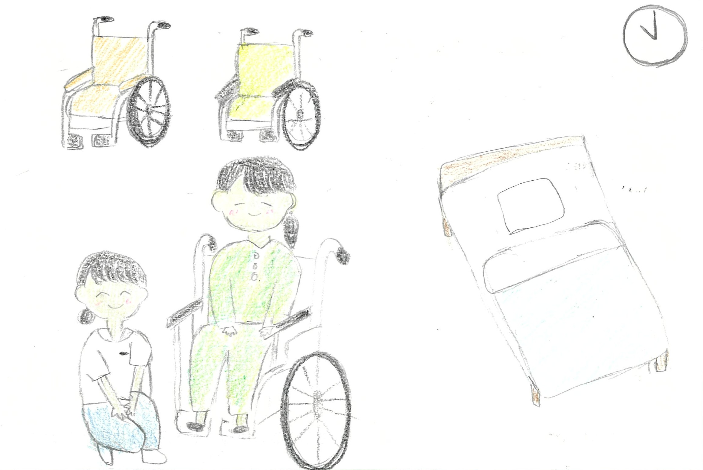 実習のためにクラスで介護練習をしているところです。初めての実習で緊張感がありました。