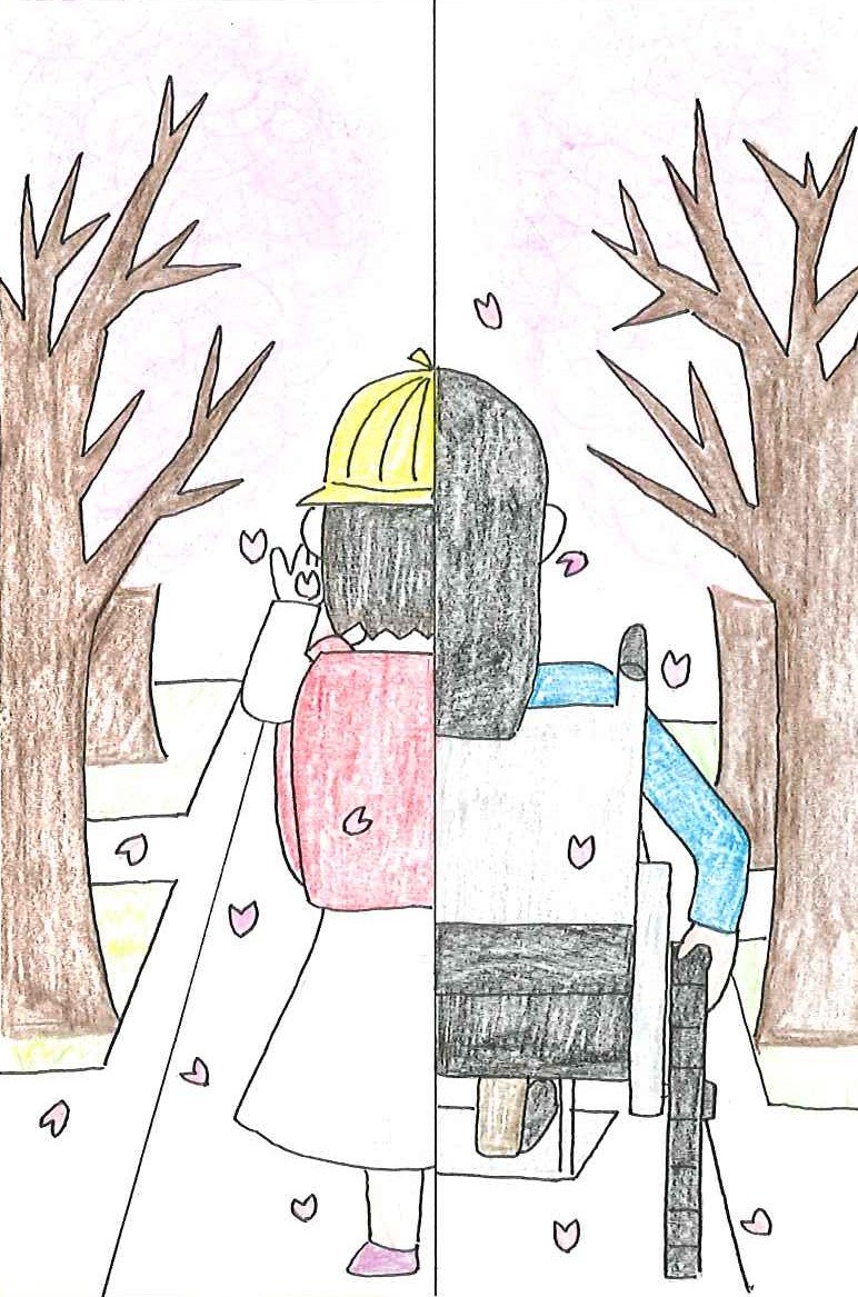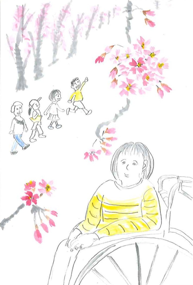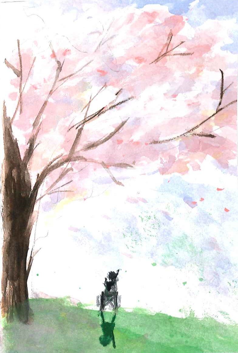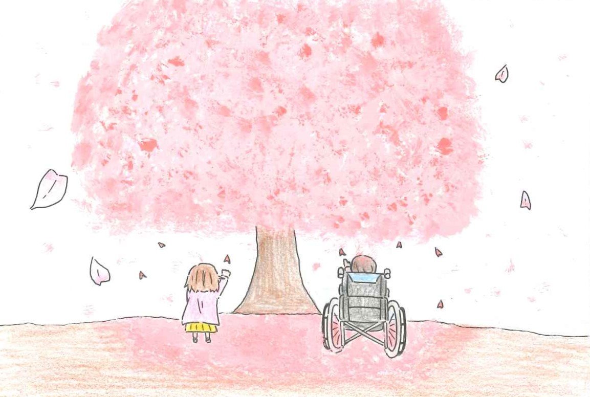 小さいころに少し低めから見た桜の木。時間がたち車いすに座って同じ目線から見て、小さいころを思いだしている。