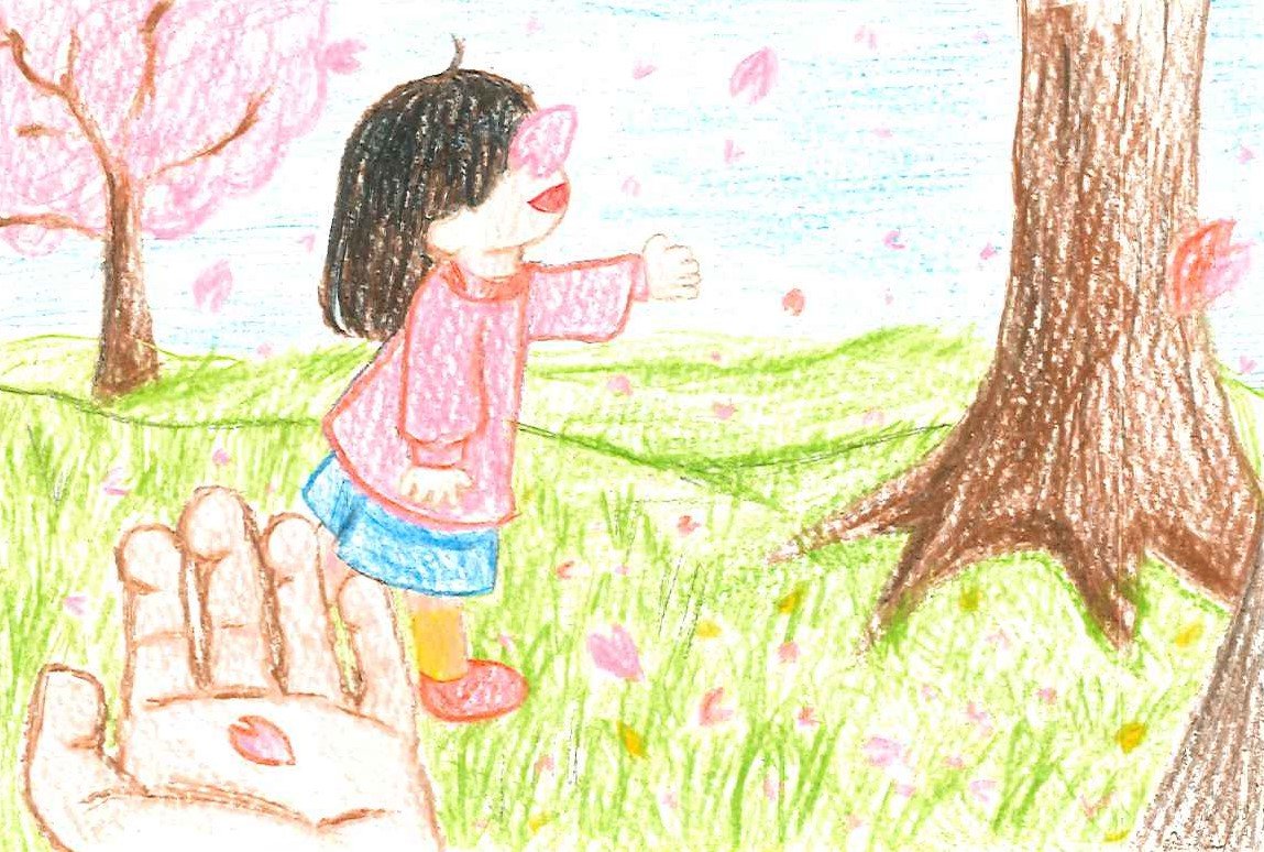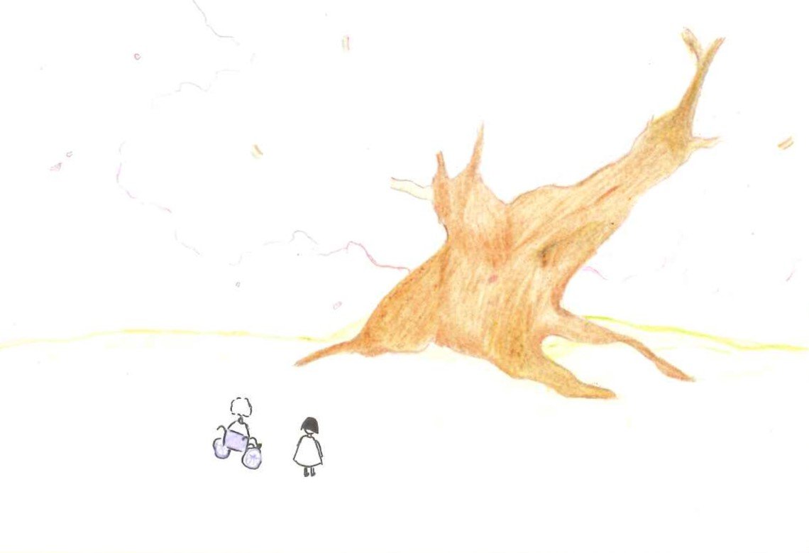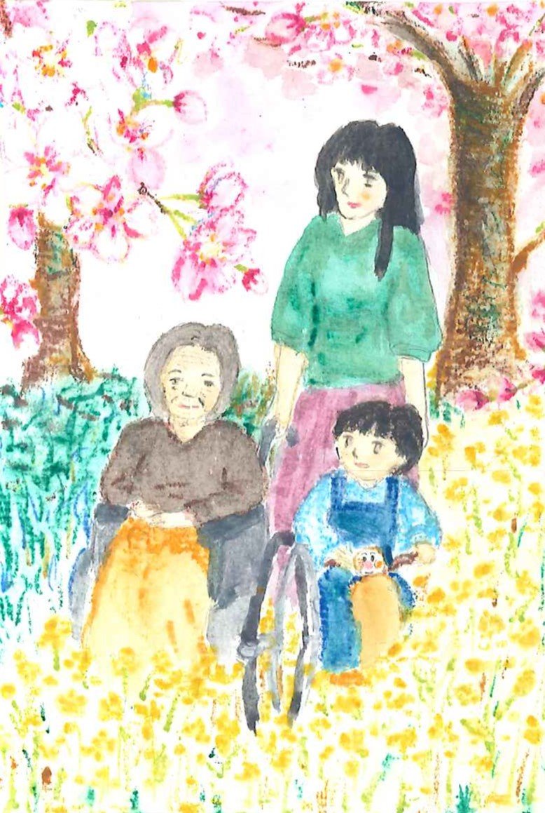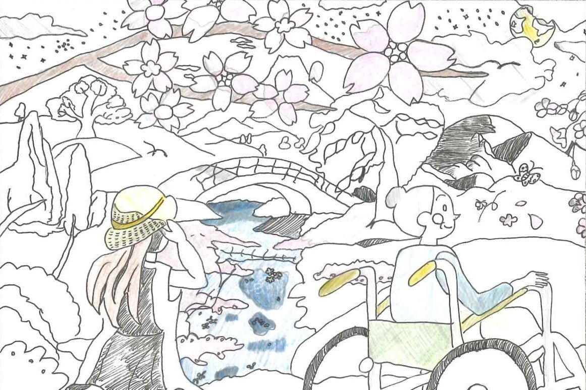 小さいころに少し低めから見た桜の木。時間がたち車いすに座って同じ目線から見て、小さいころを思いだしている。